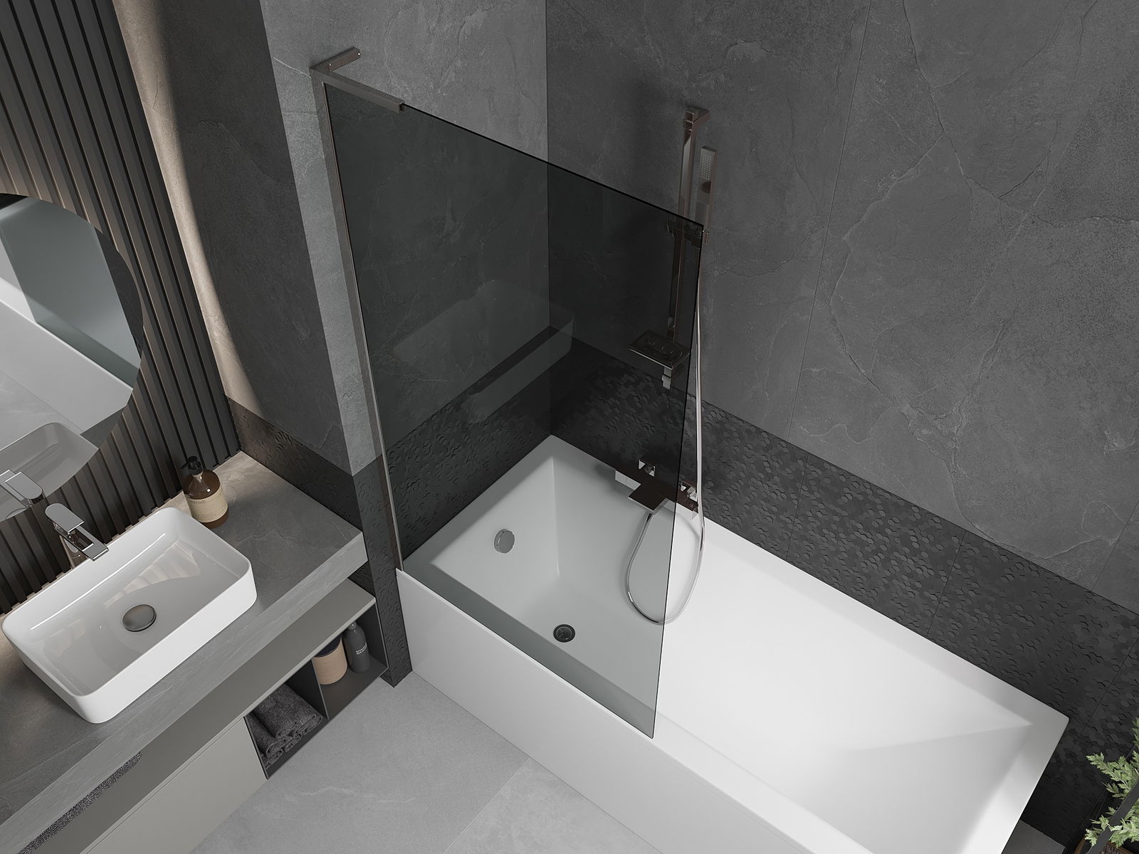 Effektiver Schutz gegen Wasser beim Baden. Der Bildschirm hat Dichtungen, die sich perfekt an das Glas des Glass und an der Badewanne der Badewanne anpassen. Eine funktionale Lösung, um Sicherheit und einfache Wartung zu gewährleisten.