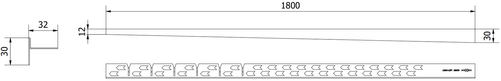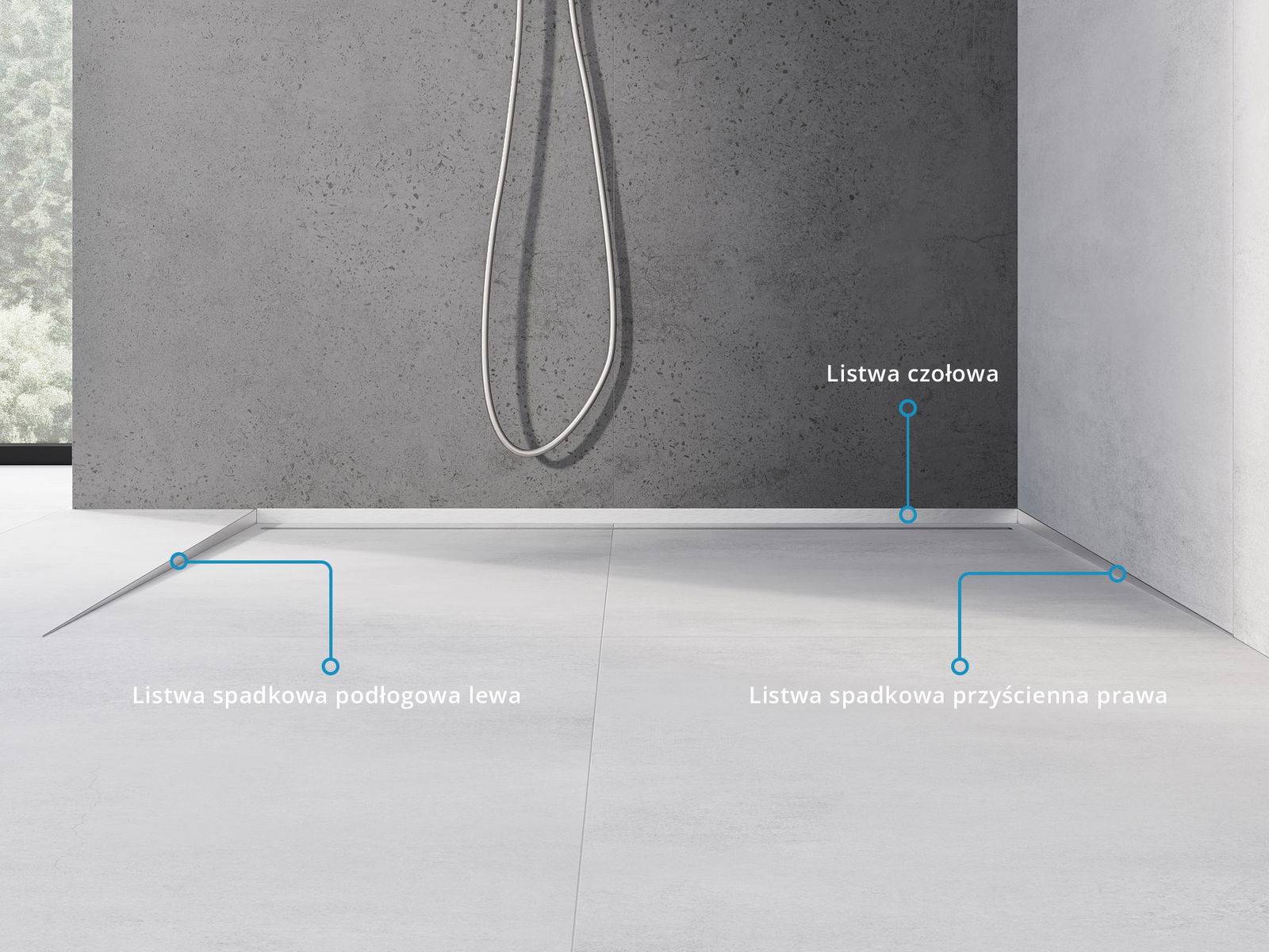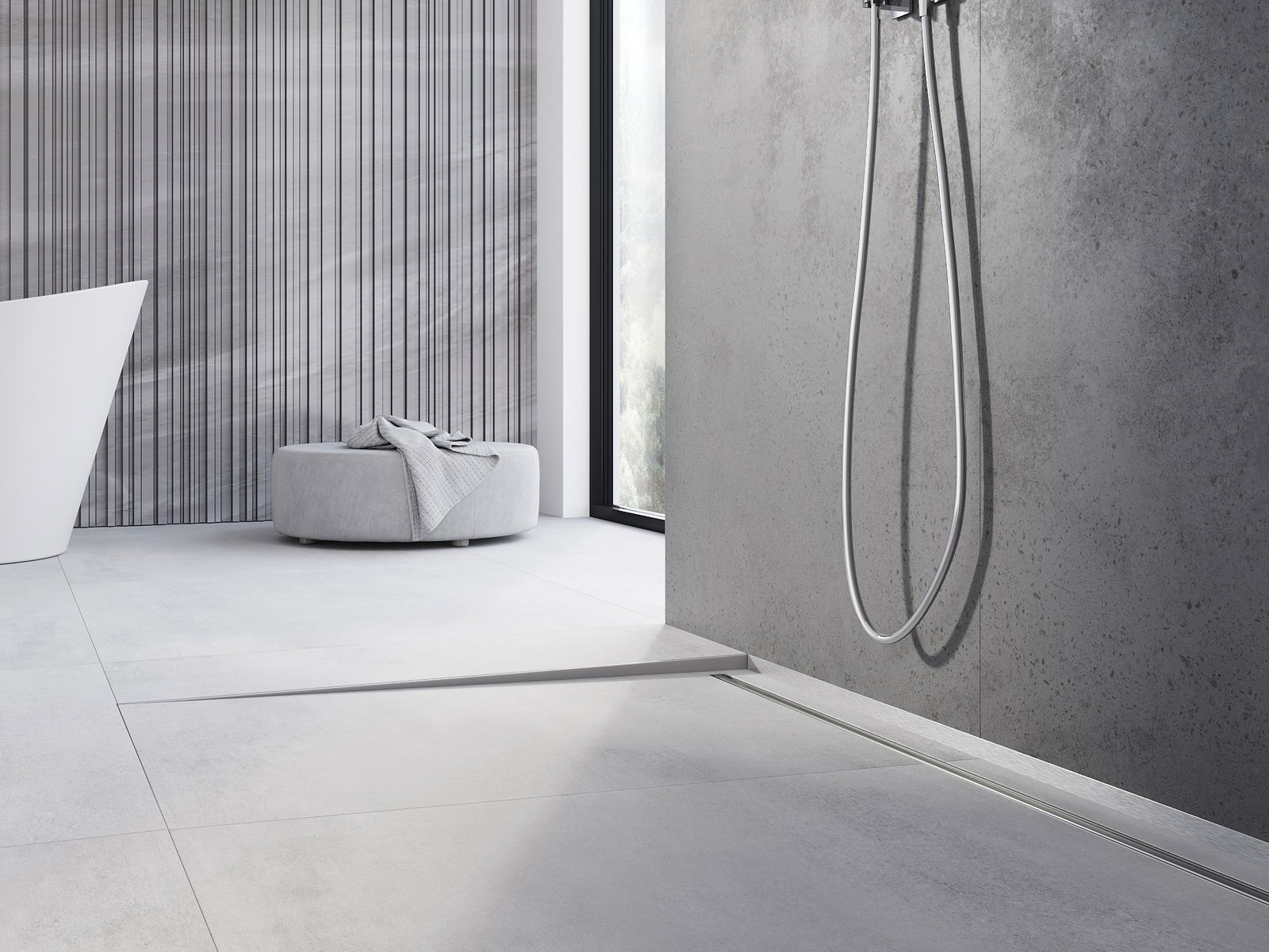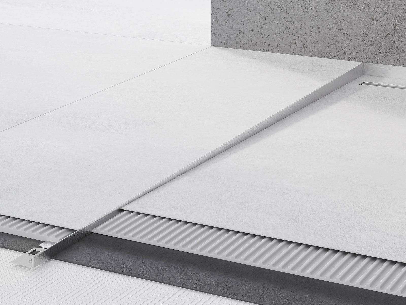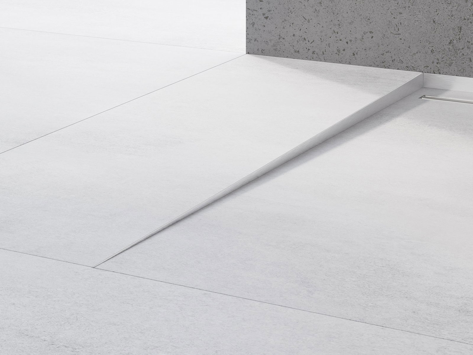 Der seitliche Rand der Leiste erzwingt ein einseitiges Gefälle zum linearen Ablauf, ohne dass eine sogenannte Umschlagskonstruktion erforderlich ist