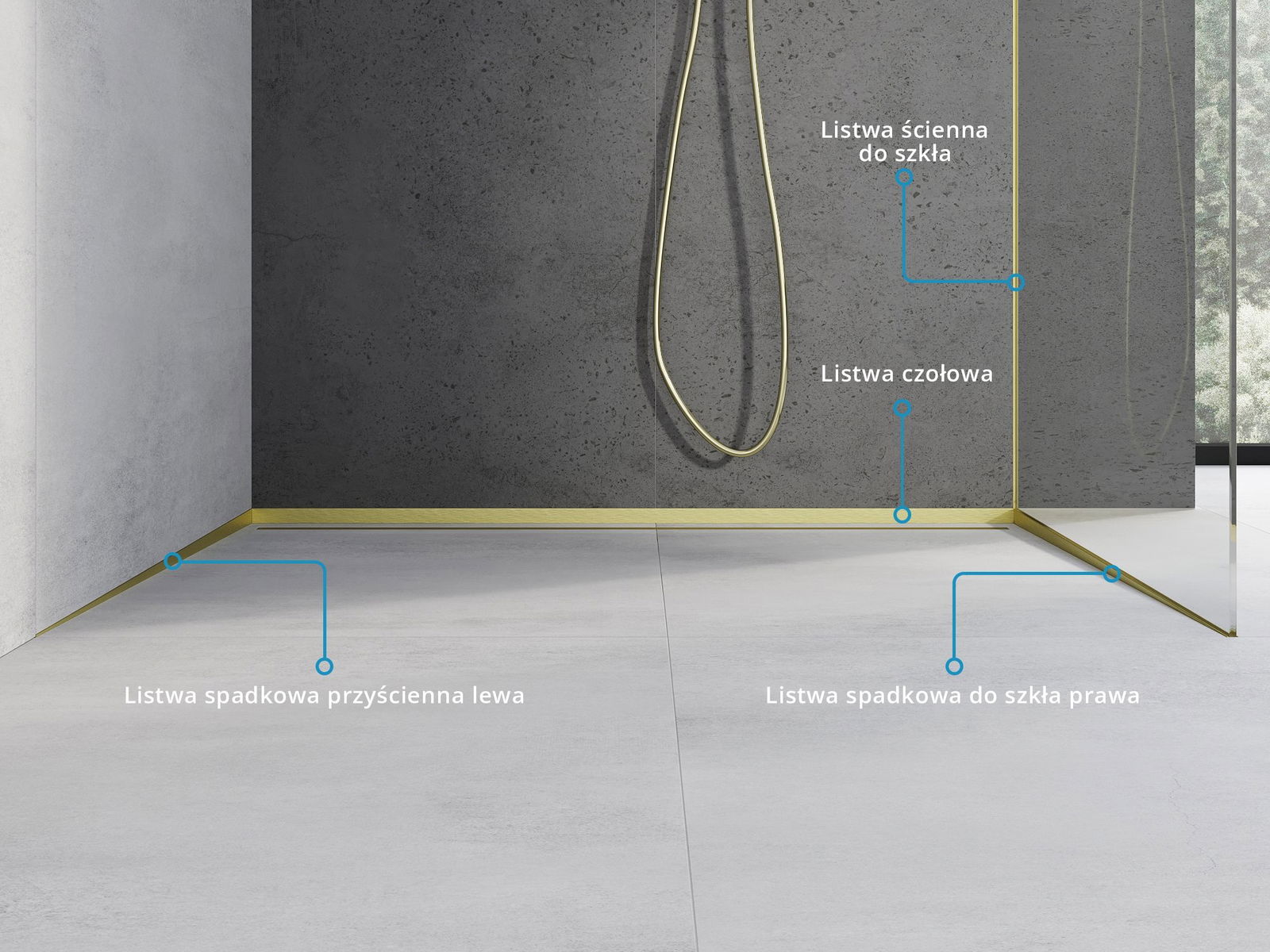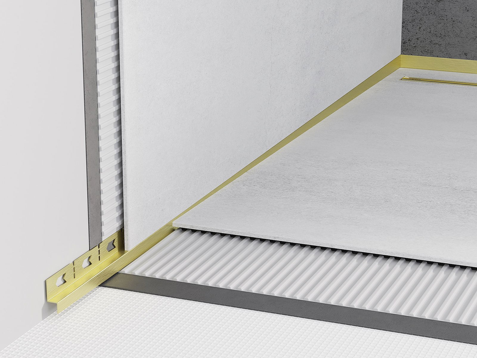 Die seitliche Kante der Leiste erzwingt einseitiges Gefälle zum Linienabfluss ohne die Notwendigkeit der Erstellung eines sogenannten Umschlags