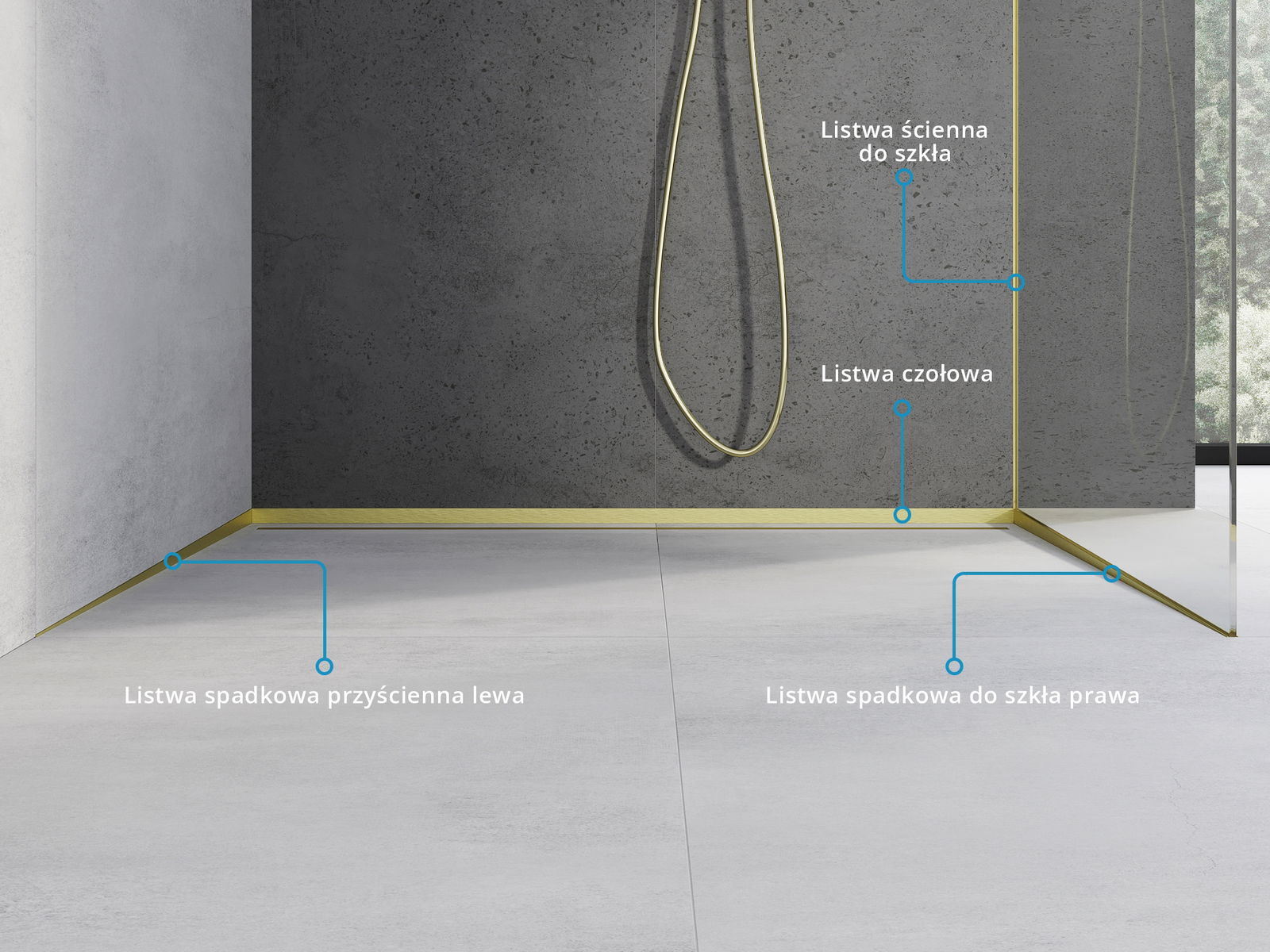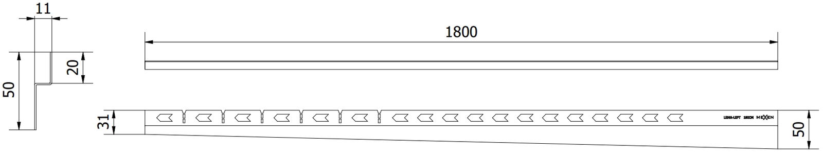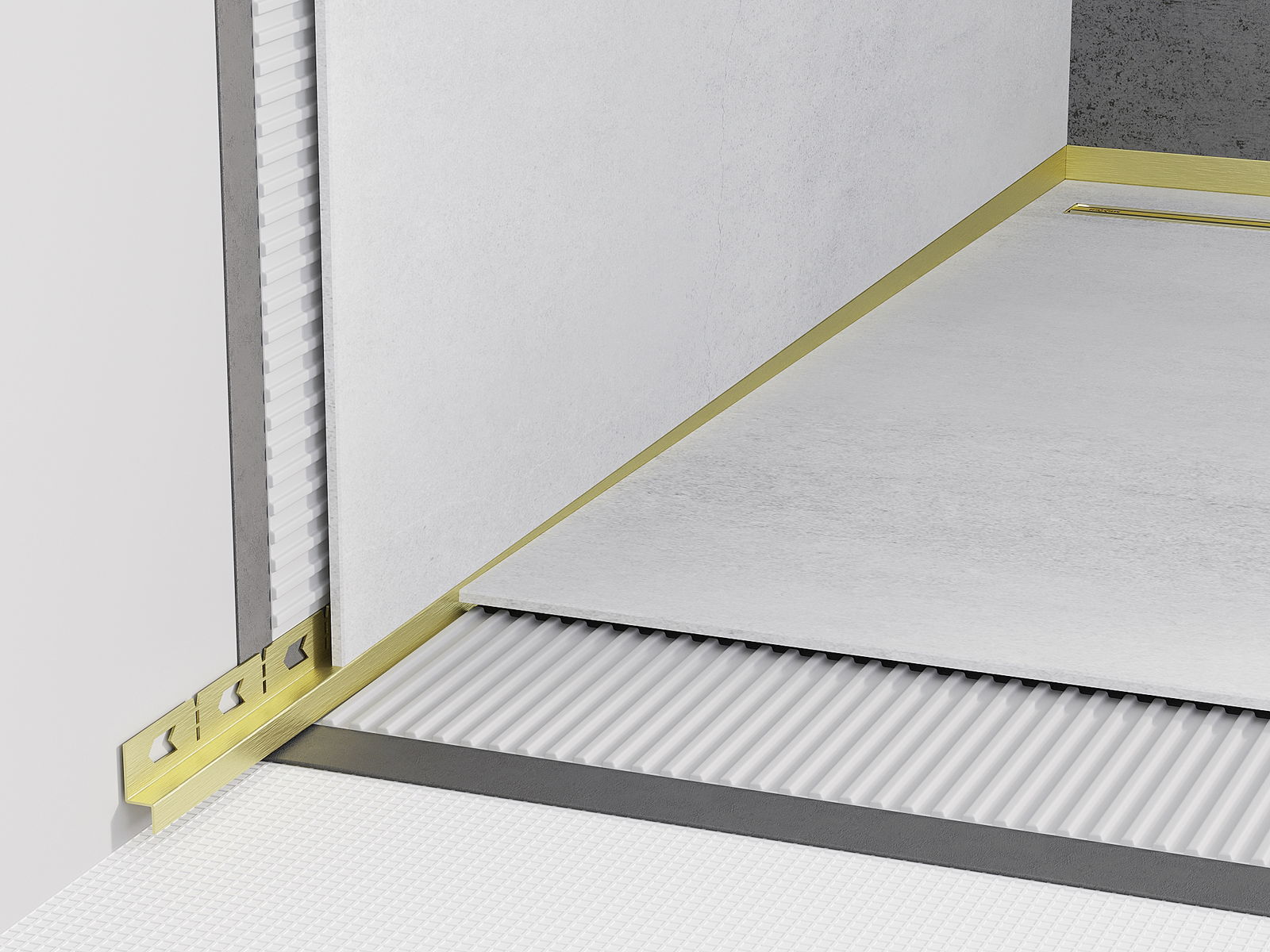 Die seitliche Kante der Schiene erzwingt einen einseitigen Gefälle zum Ablaufrinne, ohne dass ein sogenannter Umschlag ausgeführt werden muss