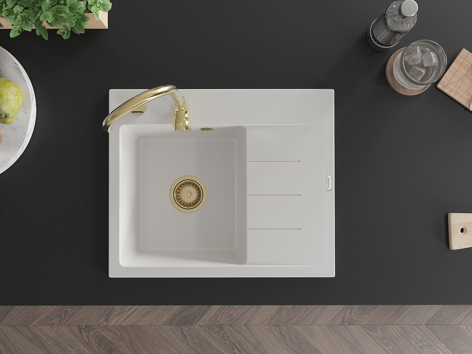 Die Spüle besteht aus hochwertigem Granit. Es ist eine elegante und vor allem praktische Ergänzung zu jeder Küche, unabhängig von ihrem Stil. Hohe Qualität und Granitdauer sorgen für eine langjährige Nutzung.