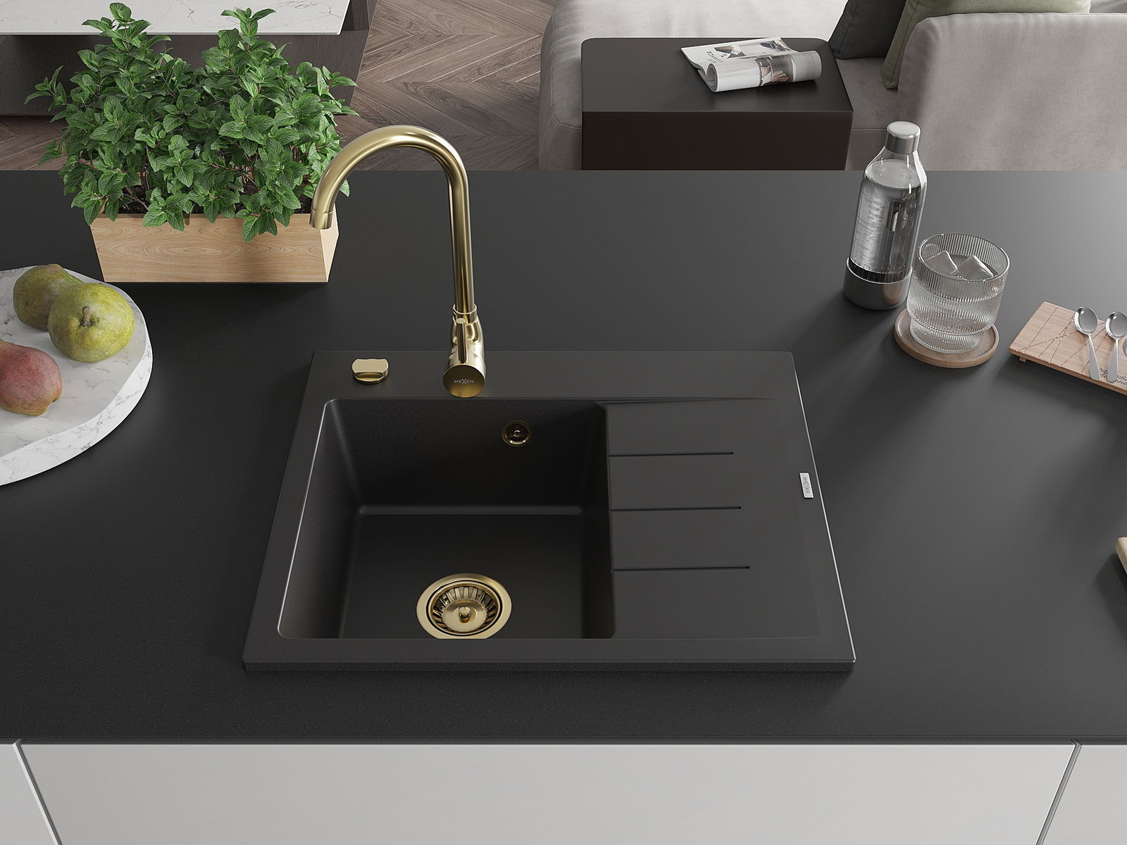 Die Spüle besteht aus hochwertigem Granit. Es ist eine elegante und vor allem praktische Ergänzung zu jeder Küche, unabhängig von ihrem Stil. Hohe Qualität und Granitdauer sorgen für eine langjährige Nutzung.