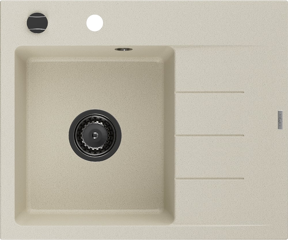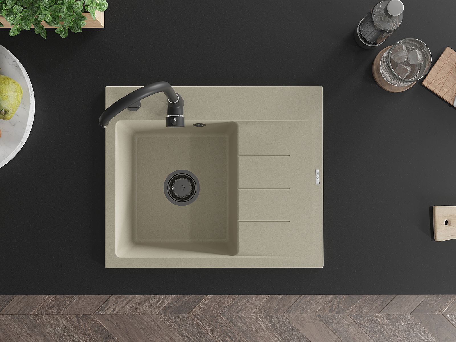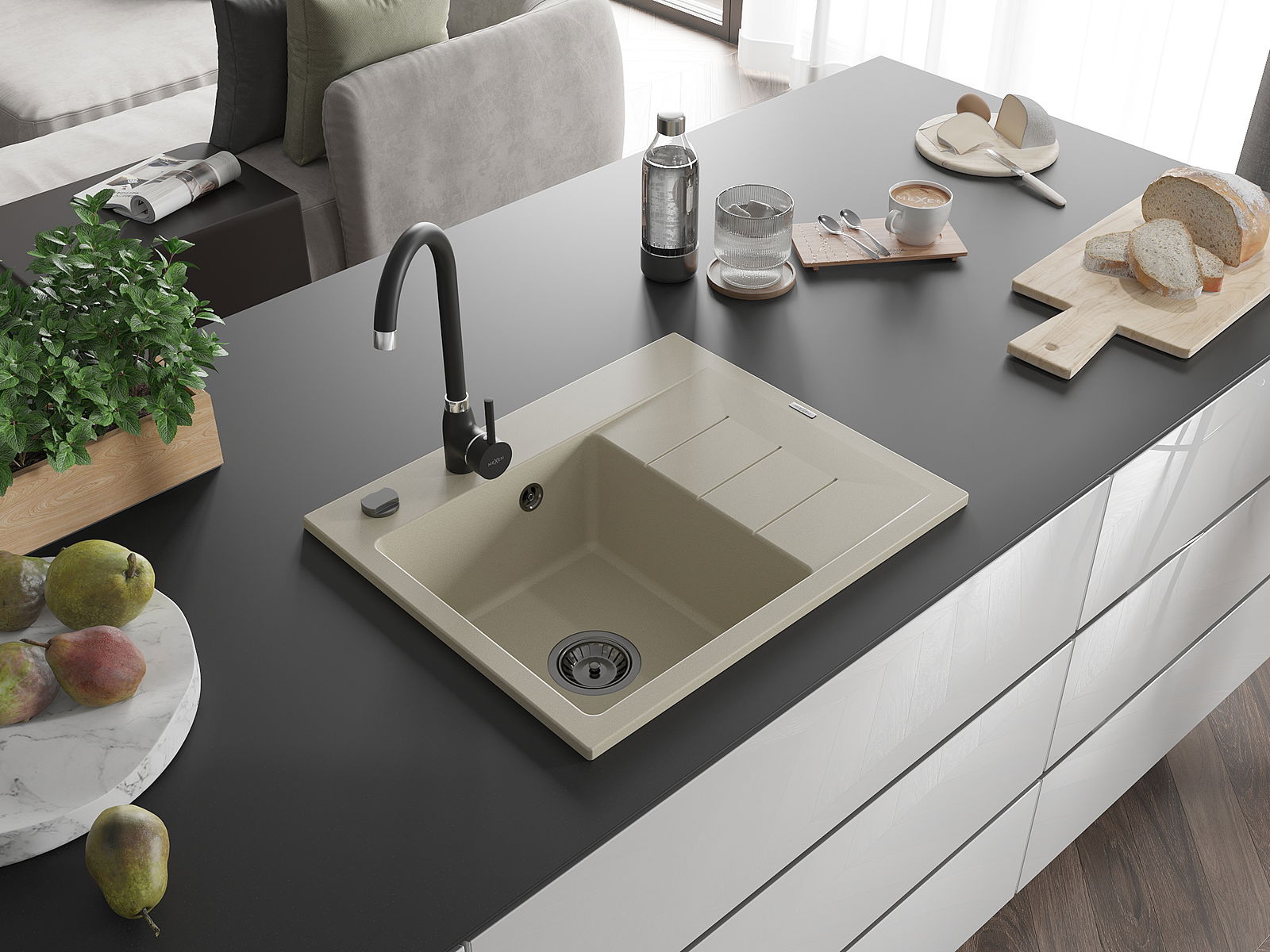 Die Spüle besteht aus hochwertigem Granit. Es ist eine elegante und vor allem praktische Ergänzung zu jeder Küche, unabhängig von ihrem Stil. Hohe Qualität und Granitdauer sorgen für eine langjährige Nutzung.