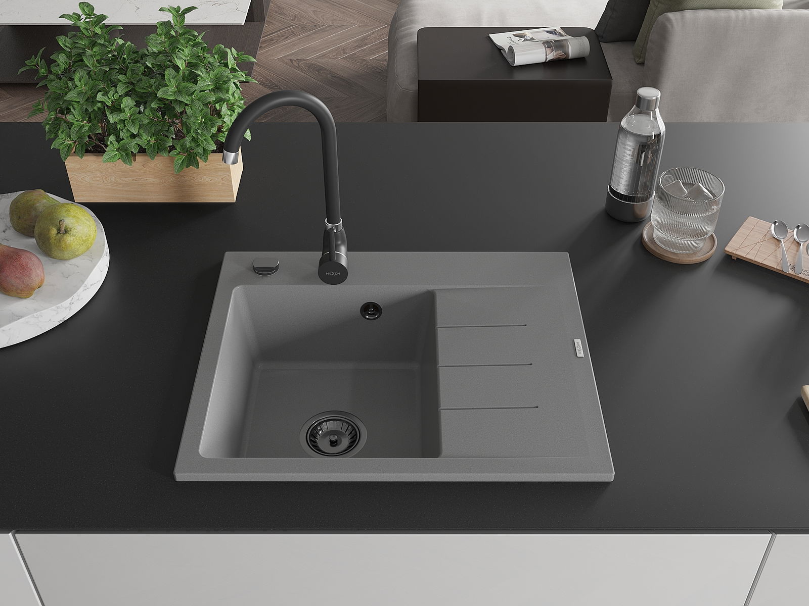 Die Spüle besteht aus hochwertigem Granit. Es ist eine elegante und vor allem praktische Ergänzung zu jeder Küche, unabhängig von ihrem Stil. Hohe Qualität und Granitdauer sorgen für eine langjährige Nutzung.