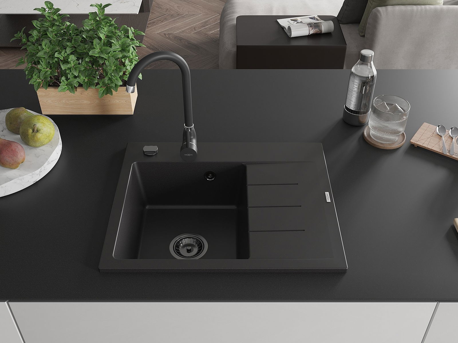 Die Spüle besteht aus hochwertigem Granit. Es ist eine elegante und vor allem praktische Ergänzung zu jeder Küche, unabhängig von ihrem Stil. Hohe Qualität und Granitdauer sorgen für eine langjährige Nutzung.