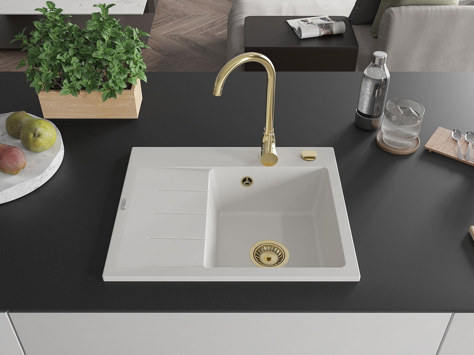 Die Spüle besteht aus hochwertigem Granit. Es ist eine elegante und vor allem praktische Ergänzung zu jeder Küche, unabhängig von ihrem Stil. Hohe Qualität und Granitdauer sorgen für eine langjährige Nutzung.