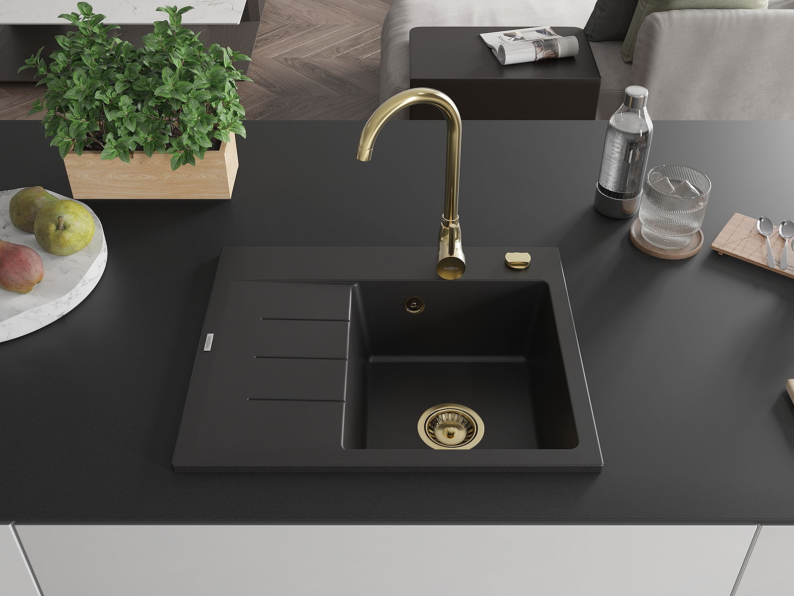 Die Spüle besteht aus hochwertigem Granit. Es ist eine elegante und vor allem praktische Ergänzung zu jeder Küche, unabhängig von ihrem Stil. Hohe Qualität und Granitdauer sorgen für eine langjährige Nutzung.