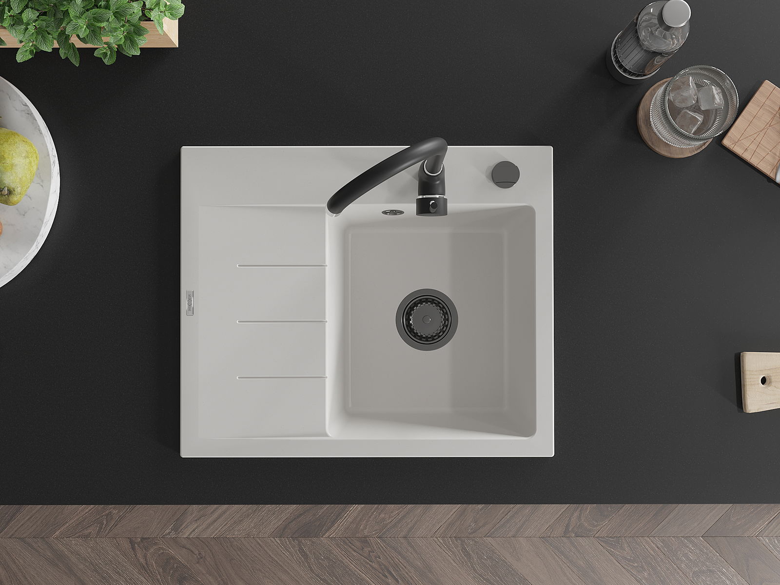 Die Spüle besteht aus hochwertigem Granit. Es ist eine elegante und vor allem praktische Ergänzung zu jeder Küche, unabhängig von ihrem Stil. Hohe Qualität und Granitdauer sorgen für eine langjährige Nutzung.