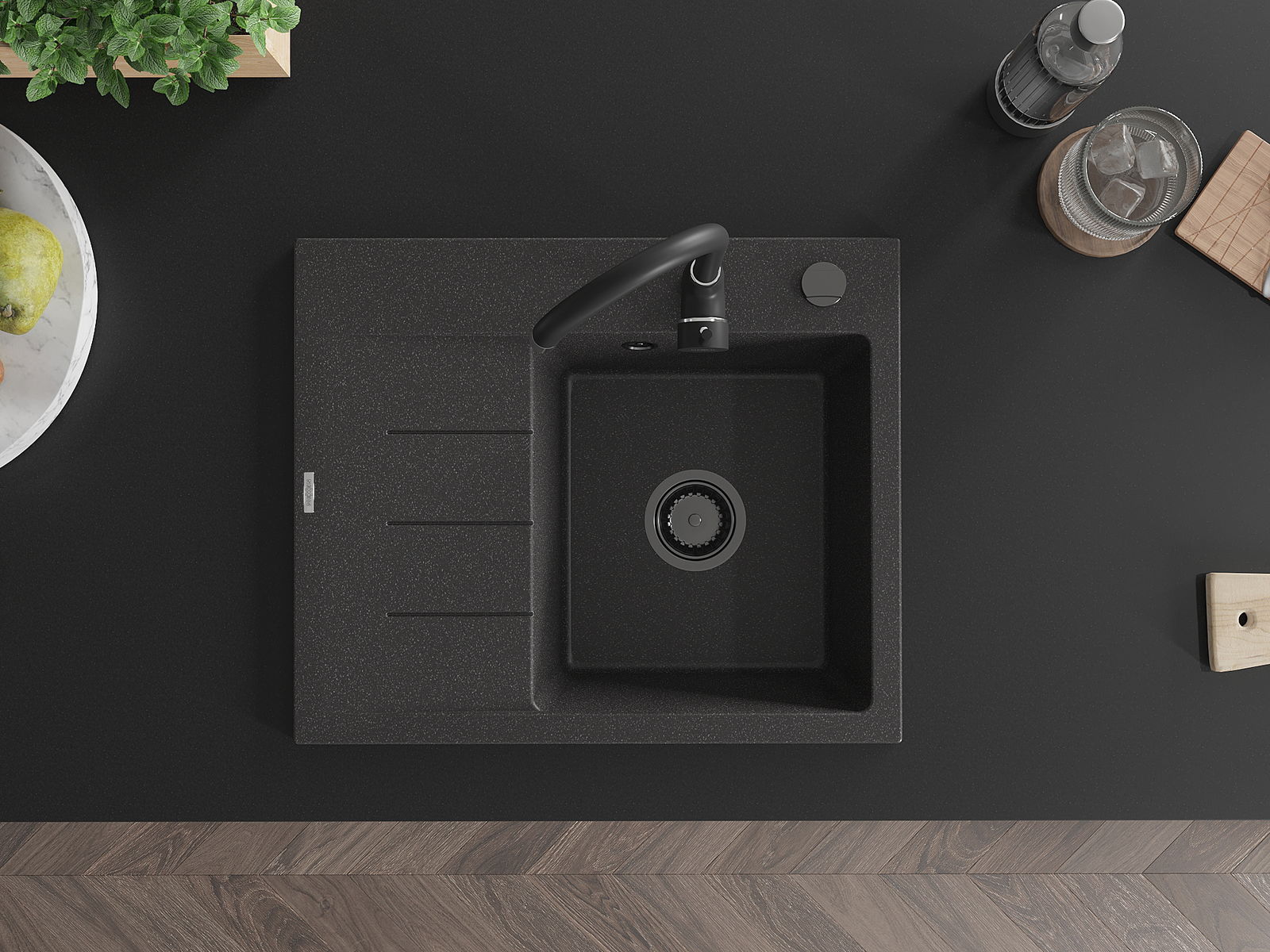 Die Spüle besteht aus hochwertigem Granit. Es ist eine elegante und vor allem praktische Ergänzung zu jeder Küche, unabhängig von ihrem Stil. Hohe Qualität und Granitdauer sorgen für eine langjährige Nutzung.