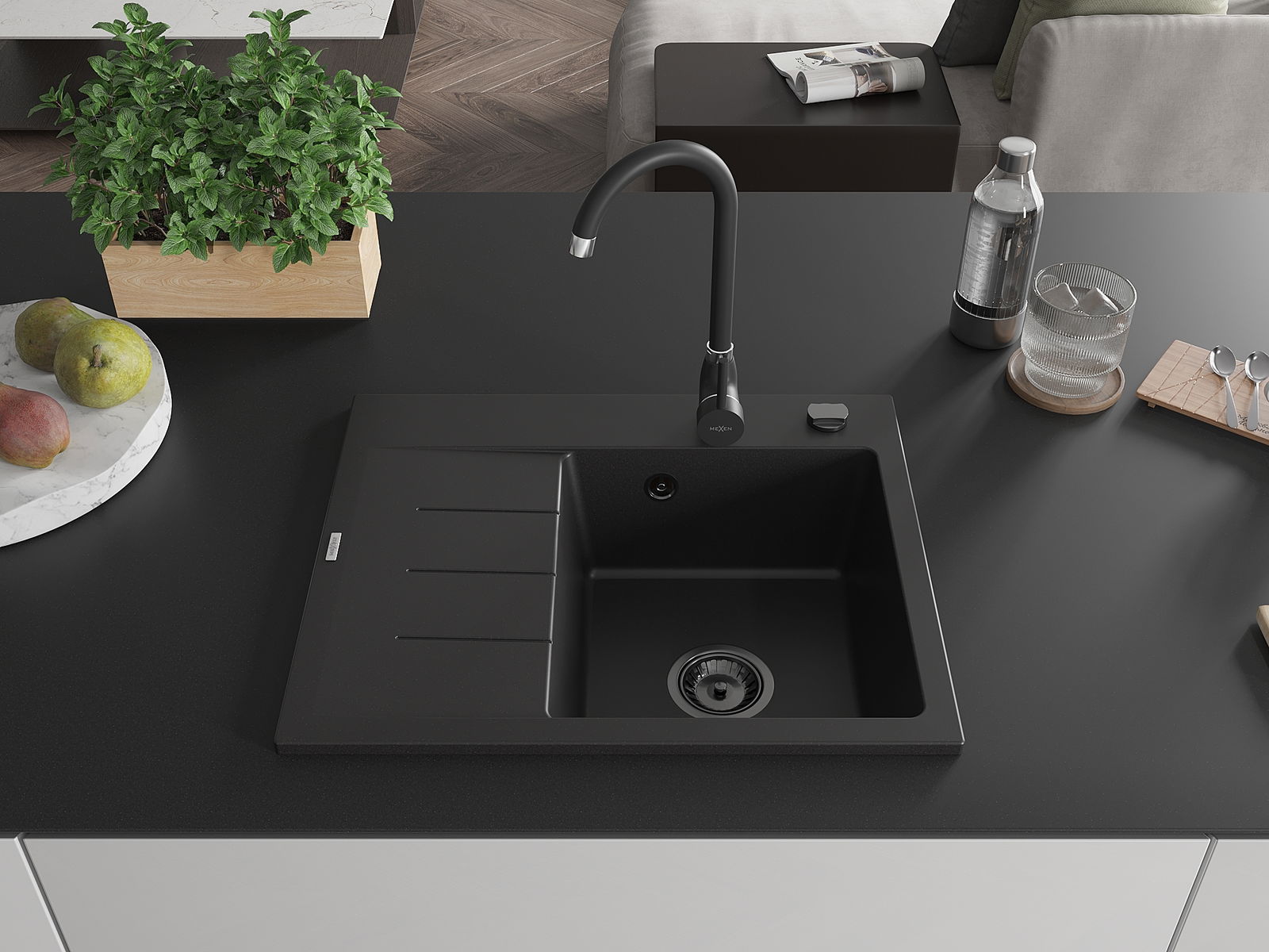 Die Spüle besteht aus hochwertigem Granit. Es ist eine elegante und vor allem praktische Ergänzung zu jeder Küche, unabhängig von ihrem Stil. Hohe Qualität und Granitdauer sorgen für eine langjährige Nutzung.