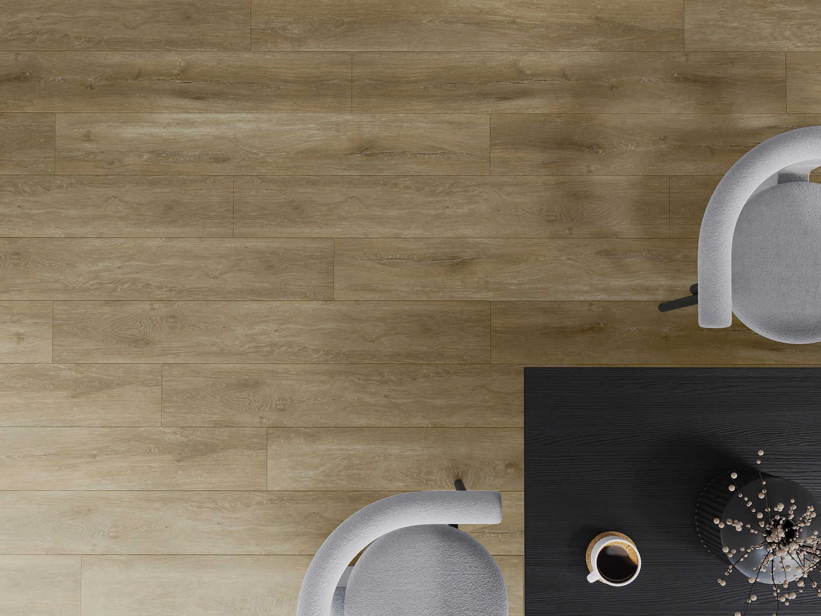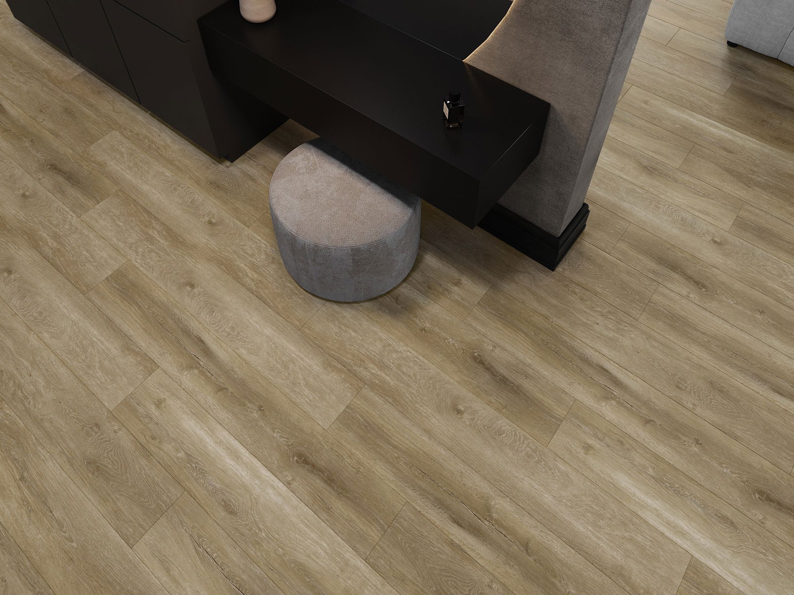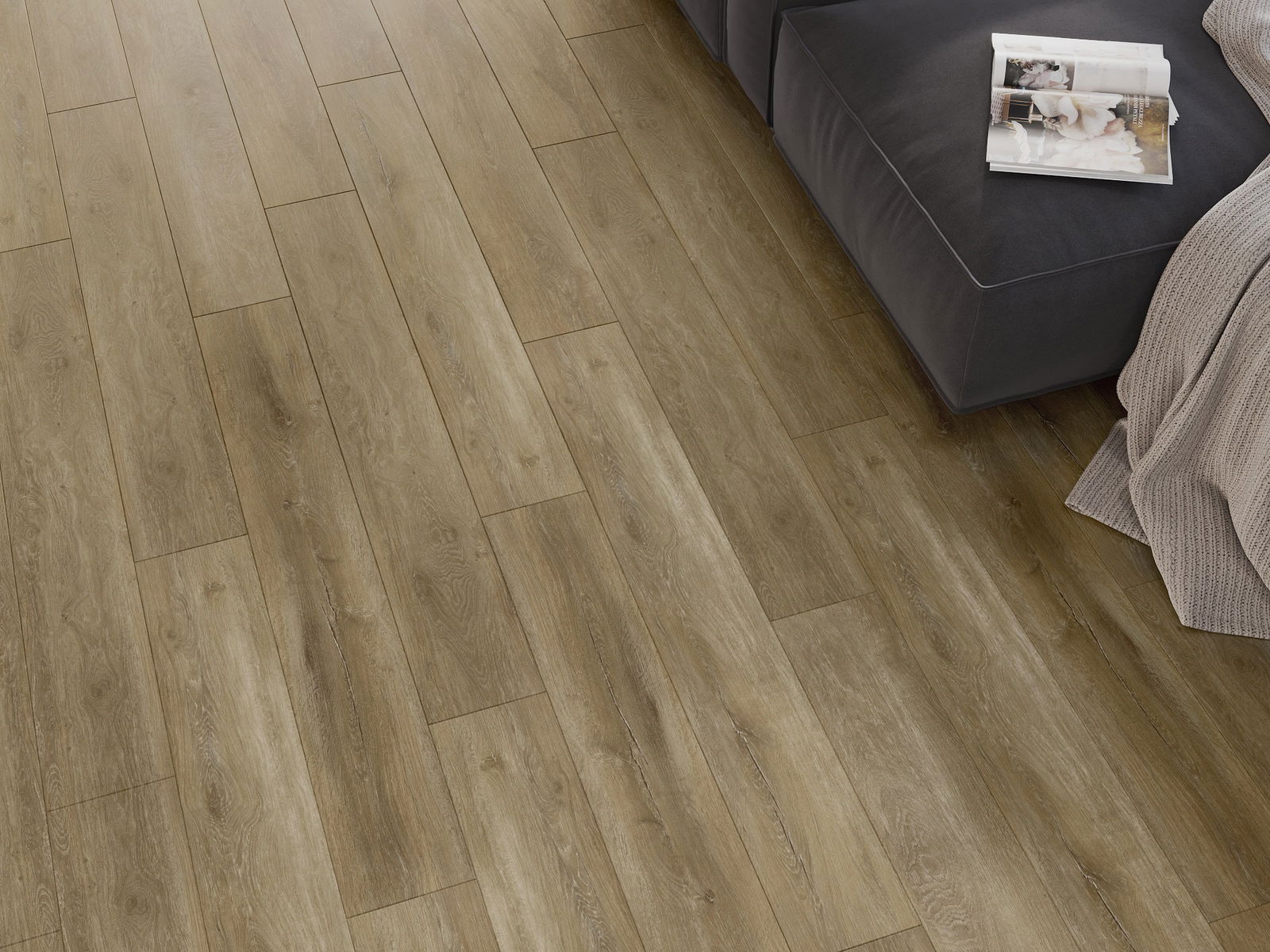 Die Paneele haben eine 4-seitige Fuge - jede Seite wurde so gefräst, dass beim Verlegen eine V-förmige Fuge zwischen den Paneelen entsteht. Dadurch wird der Boden deutlicher differenziert, was dem Boden Tiefe und Struktur verleiht.