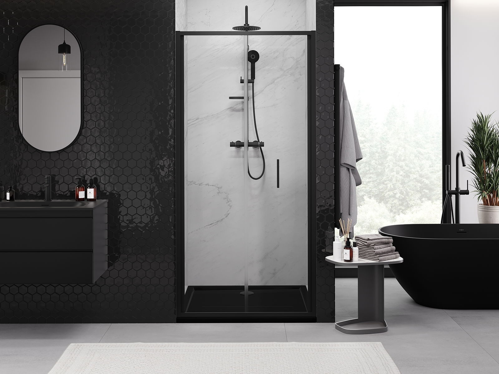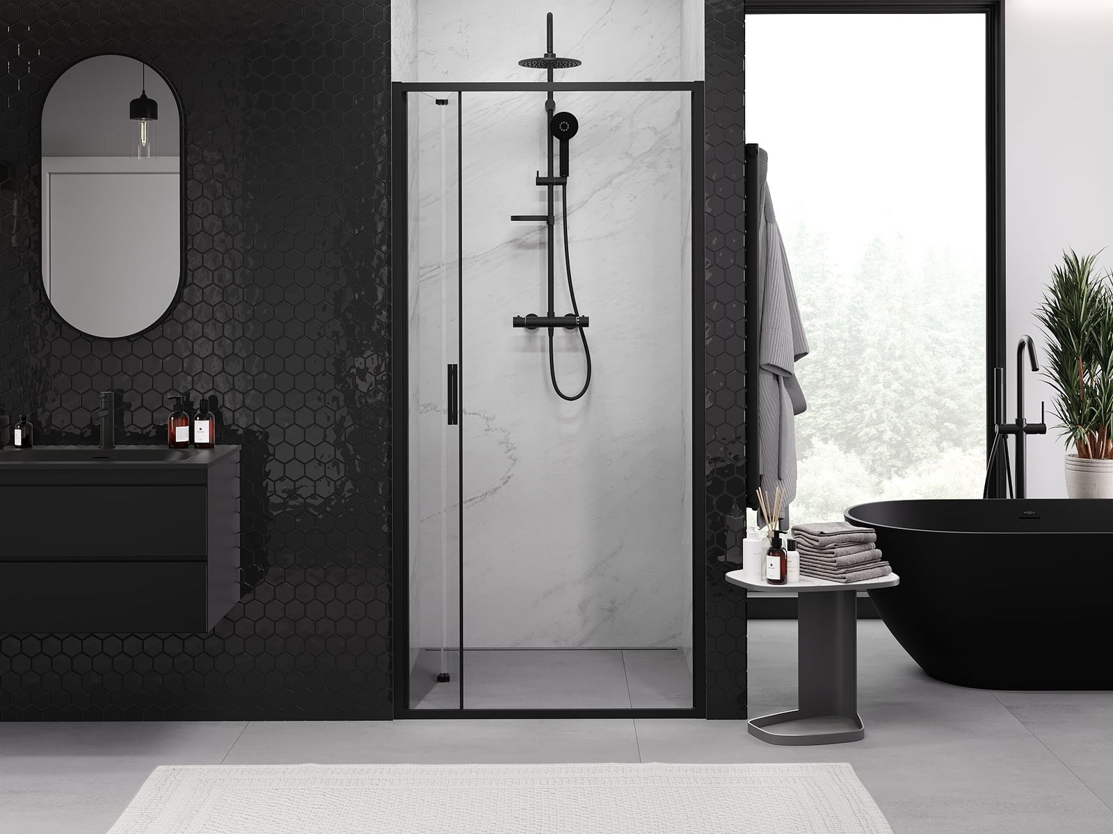 Der handliche und bequeme Griff besteht aus langlebigem und widerstandsfähigem Metall. Die modische Form in Kombination mit einer farblich auf die Profile abgestimmten Oberflächenveredelung verleiht dem Ganzen ein modernes und stilvolles Erscheinungsbild und betont die Ästhetik jedes Badezimmers.