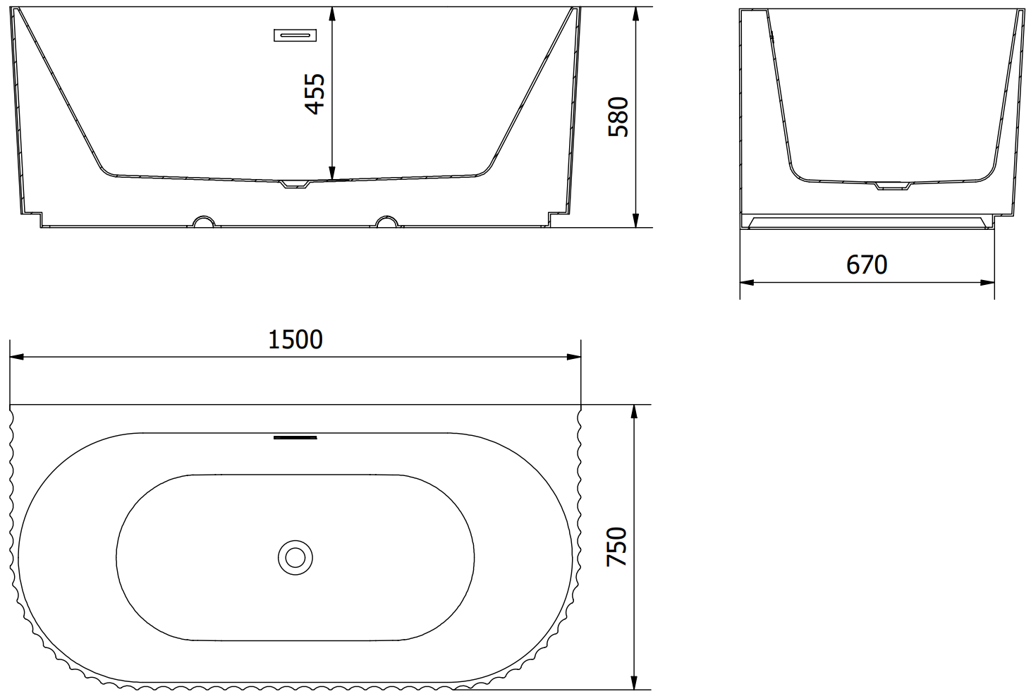 Mexen Sella freistehende geriffelte Badewanne an der Wand 150 x 75 cm, weiß glänzend, Überlauf gebürstetes Gun Gray