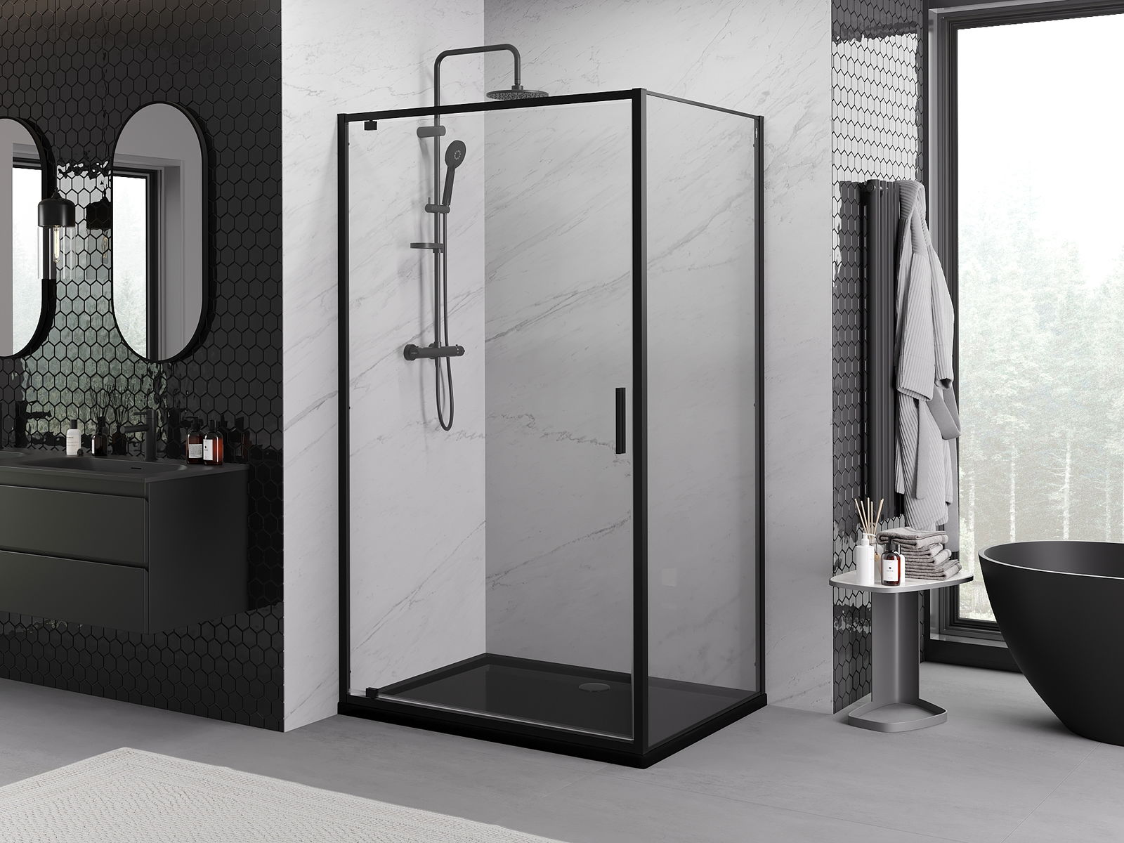 Das Produkt kann je nach Bedarf sowohl auf einer Duschwanne als auch direkt auf dem Boden montiert werden. Die universelle Montagemethode ermöglicht die Anpassung des Produkts an verschiedene Arten von Badezimmern und Raumkonfigurationen.