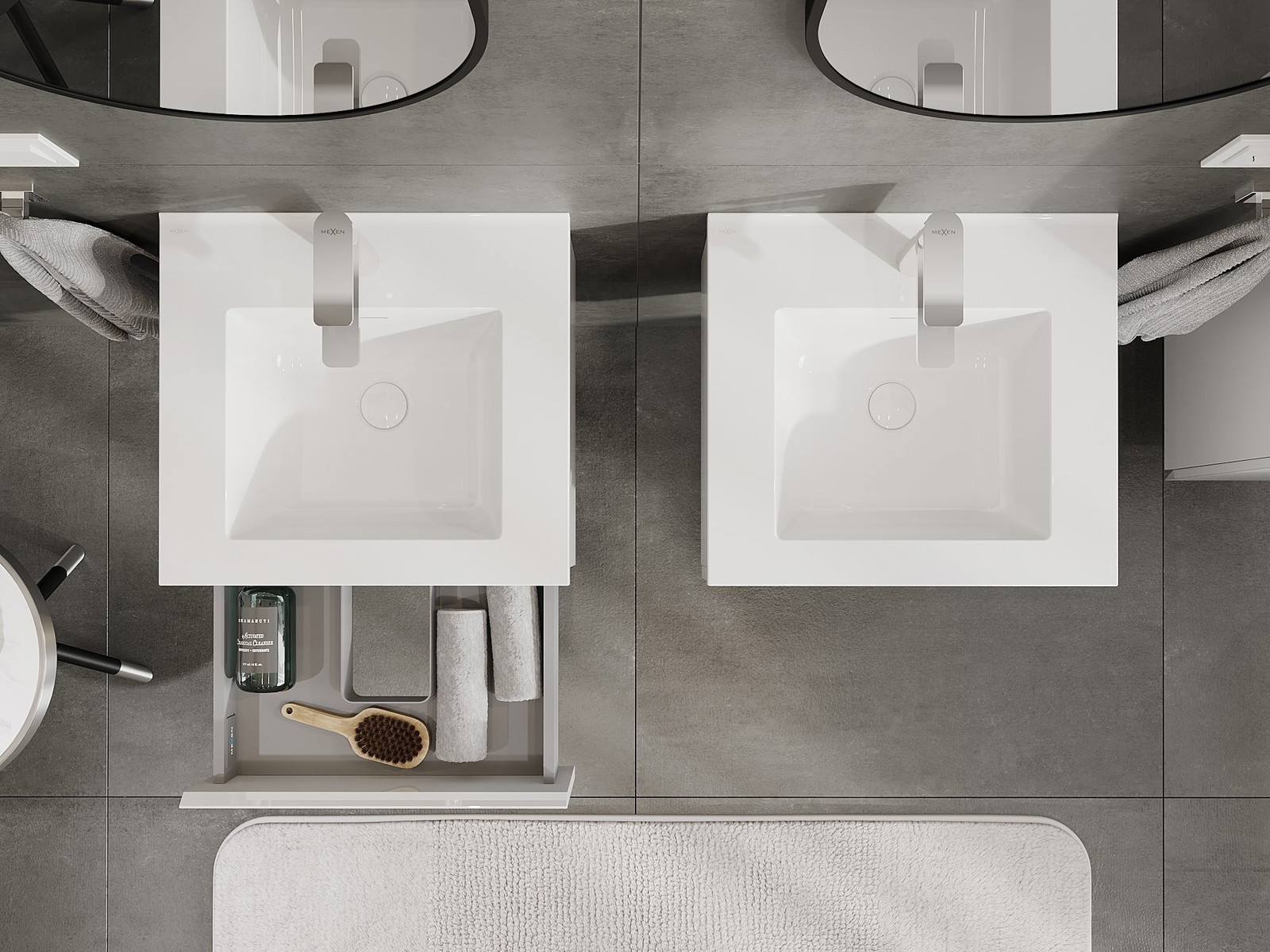 Unsere modularen Badezimmermöbel können in verschiedenen Farbkonfigurationen miteinander kombiniert werden, wodurch eine vollständige Personalisierung ermöglicht wird. Man kann sowohl das Aussehen als auch die Funktionen der einzelnen Elemente auswählen, was es erlaubt, die Möbel an eigene stilistische und funktionale Vorlieben anzupassen.