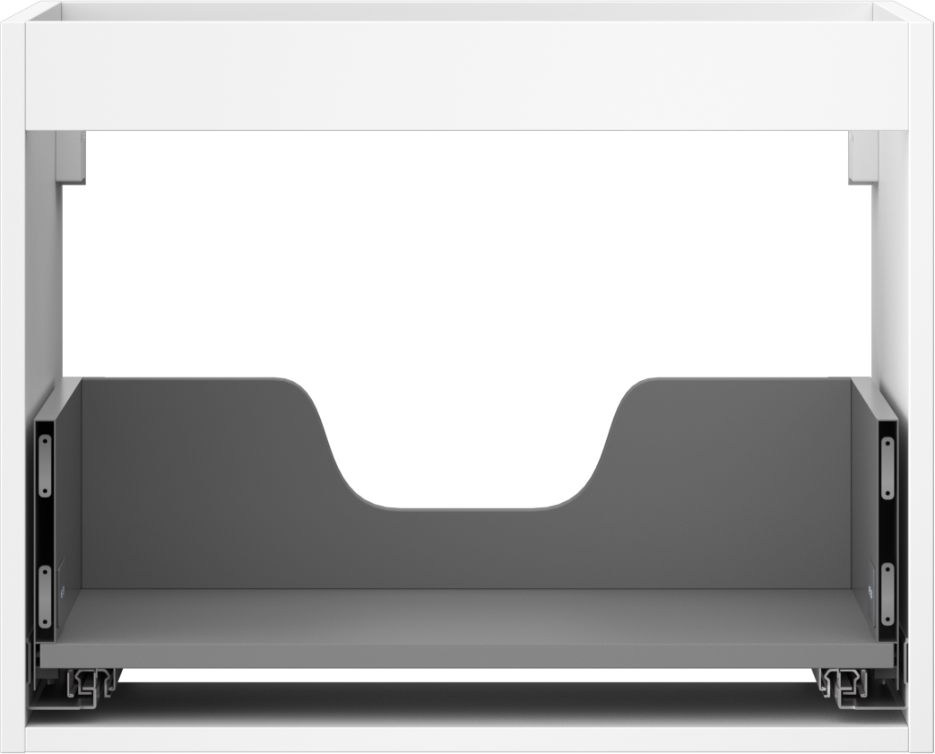 Der Ausschnitt in der Schublade ist so gestaltet, dass er den Siphon aufnehmen kann, der für Waschbeckeninstallationen erforderlich ist. Dadurch kann das Möbelstück voll funktionsfähig montiert werden, ohne auf den Platz in der Schublade zugunsten der Installation verzichten zu müssen.