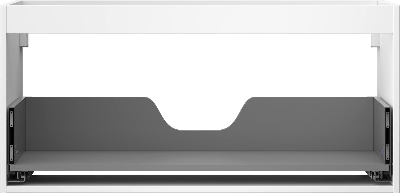 Der Ausschnitt in der Schublade ist so gestaltet, dass er den Siphon aufnehmen kann, der für Waschbeckeninstallationen erforderlich ist. Dadurch kann das Möbelstück voll funktionsfähig montiert werden, ohne auf den Platz in der Schublade zugunsten der Installation verzichten zu müssen.