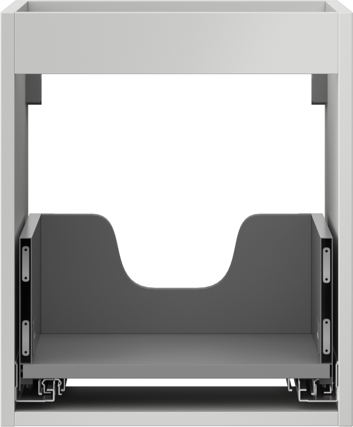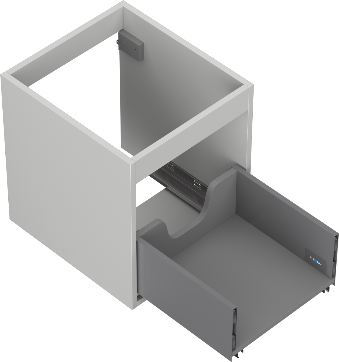 Der Ausschnitt in der Schublade ist so gestaltet, dass er den Siphon aufnehmen kann, der für Waschbeckeninstallationen erforderlich ist. Dadurch kann das Möbelstück voll funktionsfähig montiert werden, ohne auf den Platz in der Schublade zugunsten der Installation verzichten zu müssen.