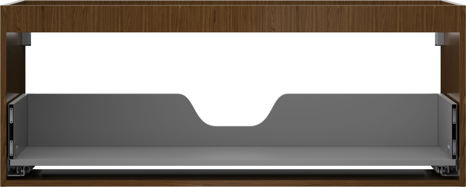 Der Ausschnitt in der Schublade ist so gestaltet, dass er den Siphon aufnehmen kann, der für Waschbeckeninstallationen erforderlich ist. Dadurch kann das Möbelstück voll funktionsfähig montiert werden, ohne auf den Platz in der Schublade zugunsten der Installation verzichten zu müssen.
