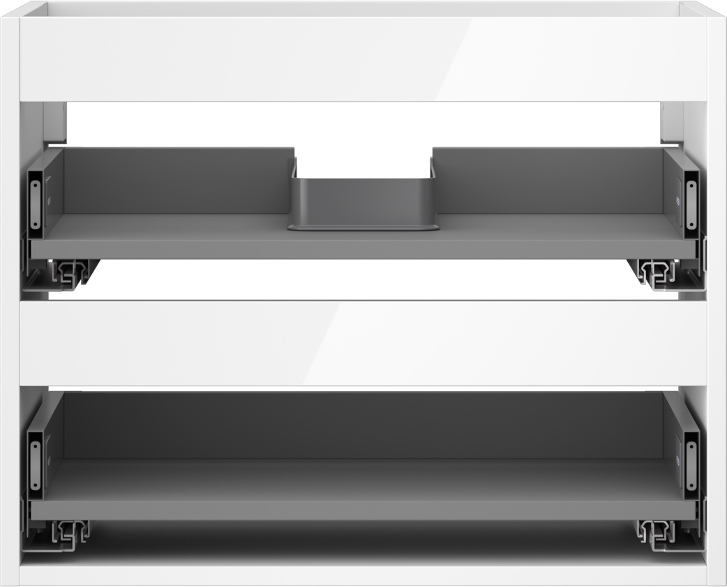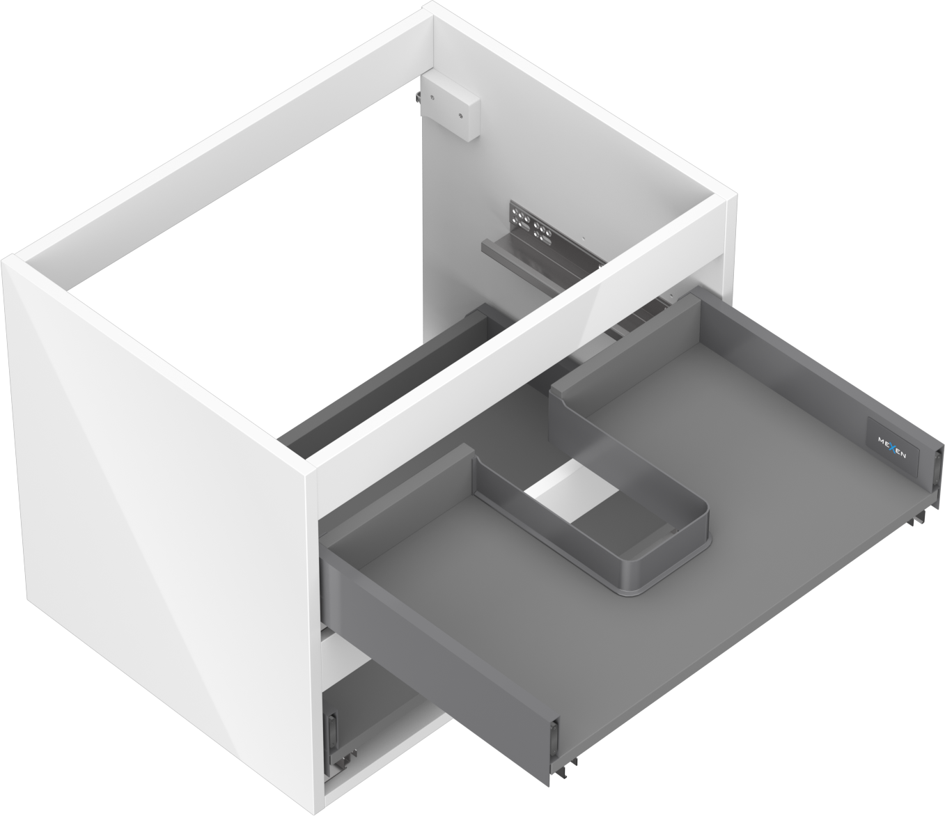 Der Ausschnitt in der Schublade ist so gestaltet, dass er den Siphon aufnehmen kann, der für Waschbeckeninstallationen erforderlich ist. Dadurch kann das Möbelstück voll funktionsfähig montiert werden, ohne auf den Platz in der Schublade zugunsten der Installation verzichten zu müssen.