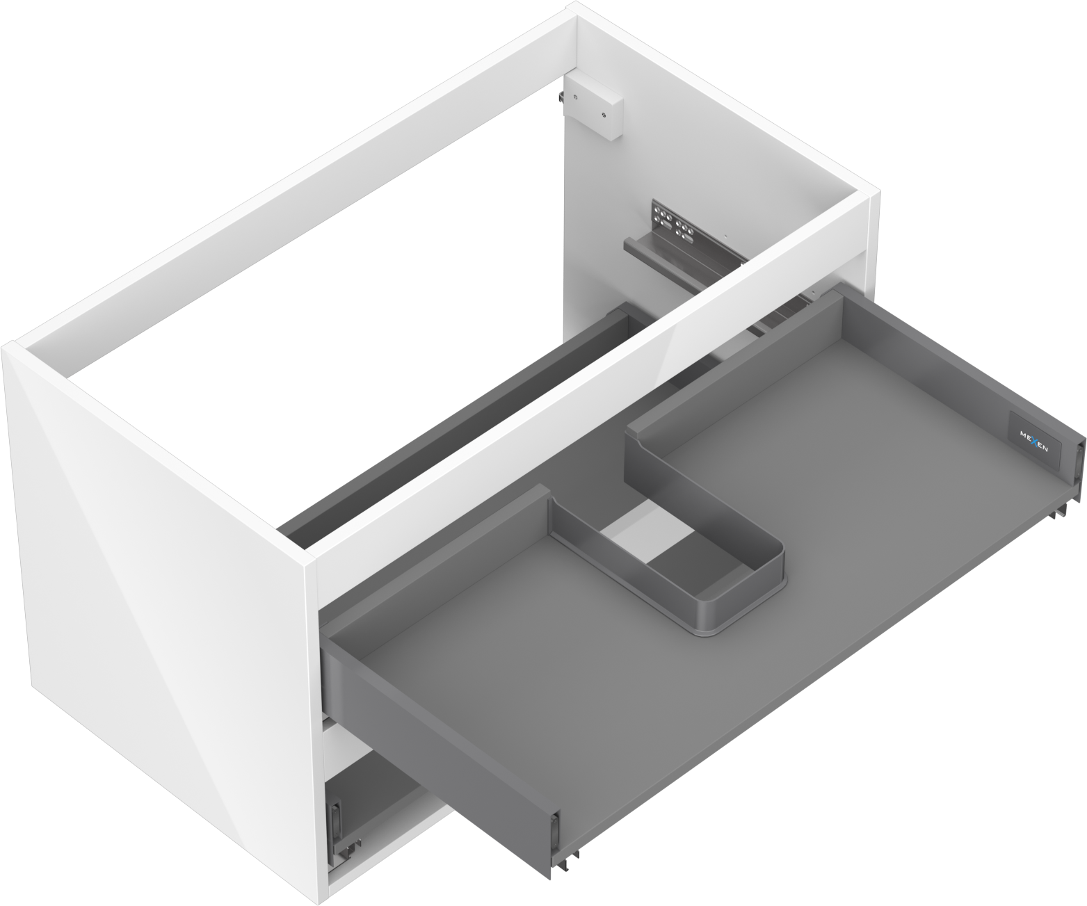 Der Ausschnitt in der Schublade ist so gestaltet, dass er den Siphon aufnehmen kann, der für Waschbeckeninstallationen erforderlich ist. Dadurch kann das Möbelstück voll funktionsfähig montiert werden, ohne auf den Platz in der Schublade zugunsten der Installation verzichten zu müssen.