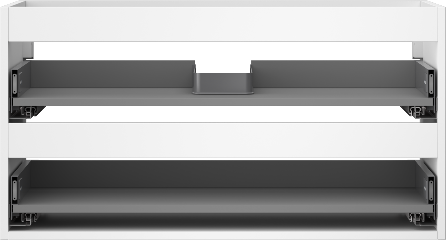 Der Ausschnitt in der Schublade ist so gestaltet, dass er den Siphon aufnehmen kann, der für Waschbeckeninstallationen erforderlich ist. Dadurch kann das Möbelstück voll funktionsfähig montiert werden, ohne auf den Platz in der Schublade zugunsten der Installation verzichten zu müssen.