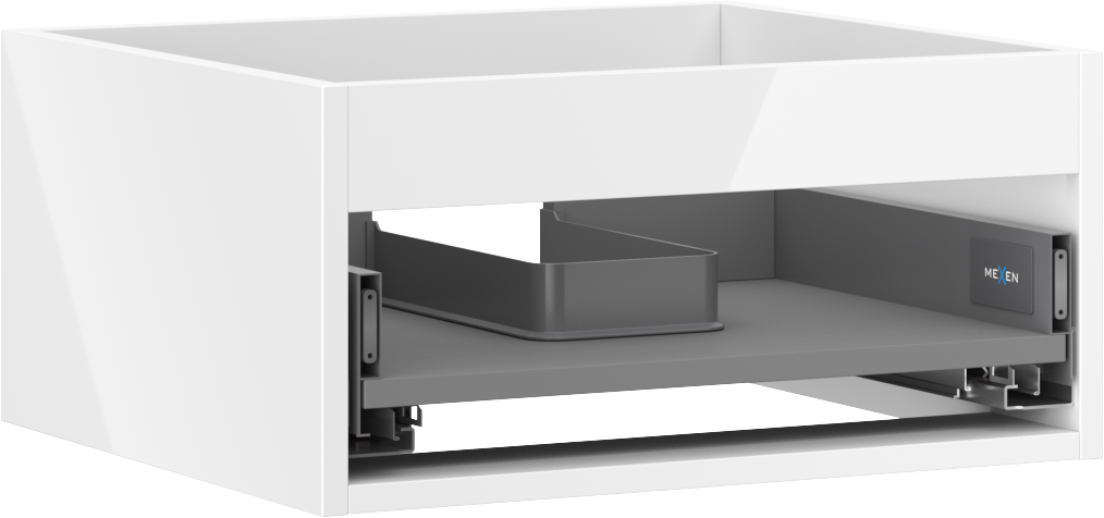 Eine Schublade mit Vollauszug ist eine Art von Schublade, die mit einem Mechanismus ausgestattet ist, der ein vollständiges Herausziehen aus dem Möbelkorpus ermöglicht. Ein solcher Mechanismus ermöglicht einen einfacheren Zugriff auf den Inhalt der Schublade, da es nicht notwendig ist, nach den hinteren Kanten zu greifen.