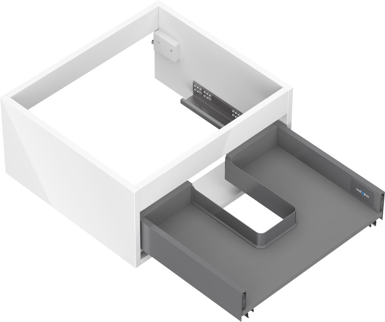 Der Ausschnitt in der Schublade ist so gestaltet, dass er den Siphon aufnehmen kann, der für Waschbeckeninstallationen erforderlich ist. Dadurch kann das Möbelstück voll funktionsfähig montiert werden, ohne auf den Platz in der Schublade zugunsten der Installation verzichten zu müssen.