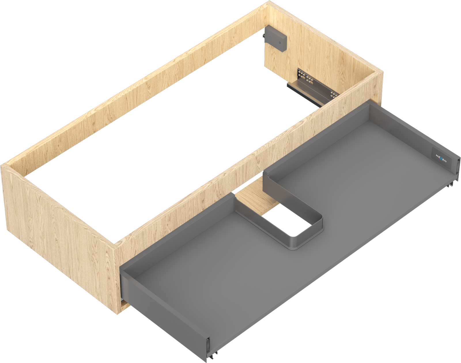 Der Ausschnitt in der Schublade ist so gestaltet, dass er den Siphon aufnehmen kann, der für Waschbeckeninstallationen erforderlich ist. Dadurch kann das Möbelstück voll funktionsfähig montiert werden, ohne auf den Platz in der Schublade zugunsten der Installation verzichten zu müssen.