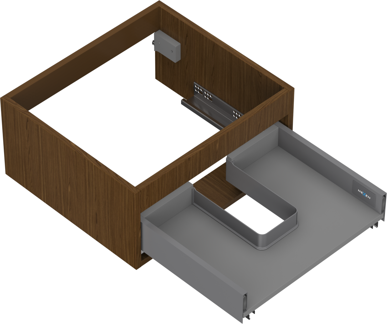 Der Ausschnitt in der Schublade ist so gestaltet, dass er den Siphon aufnehmen kann, der für Waschbeckeninstallationen erforderlich ist. Dadurch kann das Möbelstück voll funktionsfähig montiert werden, ohne auf den Platz in der Schublade zugunsten der Installation verzichten zu müssen.