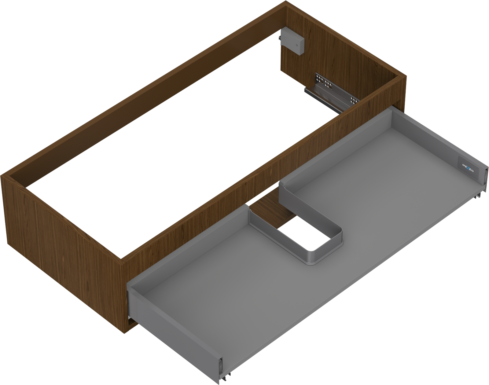 Der Ausschnitt in der Schublade ist so gestaltet, dass er den Siphon aufnehmen kann, der für Waschbeckeninstallationen erforderlich ist. Dadurch kann das Möbelstück voll funktionsfähig montiert werden, ohne auf den Platz in der Schublade zugunsten der Installation verzichten zu müssen.