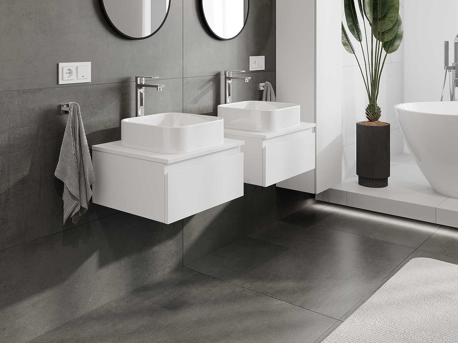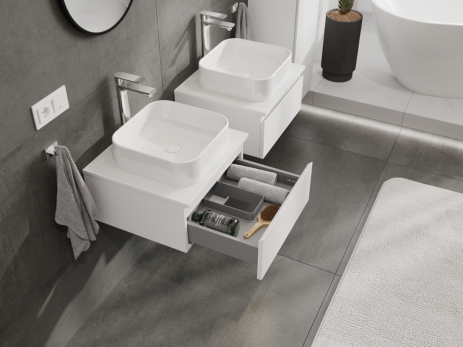 Unsere modularen Badezimmermöbel können in verschiedenen Farbkonfigurationen miteinander kombiniert werden, wodurch eine vollständige Personalisierung ermöglicht wird. Man kann sowohl das Aussehen als auch die Funktionen der einzelnen Elemente auswählen, was es erlaubt, die Möbel an eigene stilistische und funktionale Vorlieben anzupassen.