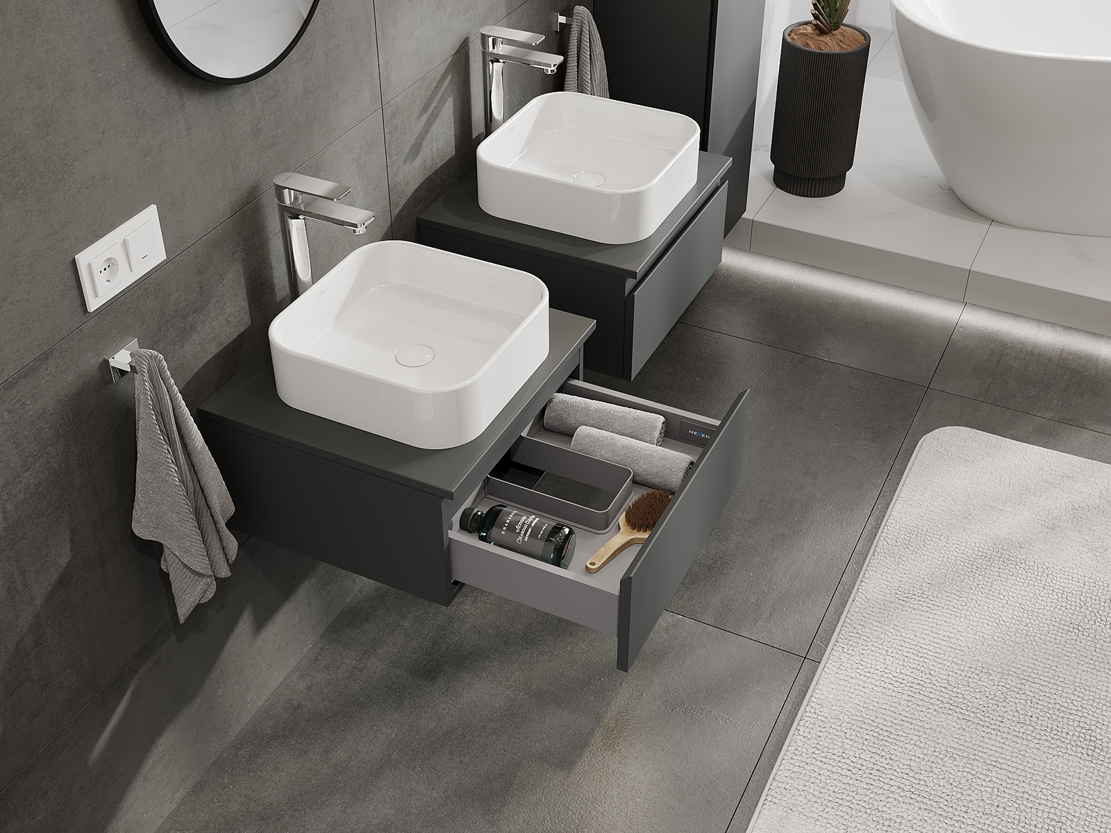 Unsere modularen Badezimmermöbel können in verschiedenen Farbkonfigurationen miteinander kombiniert werden, wodurch eine vollständige Personalisierung ermöglicht wird. Man kann sowohl das Aussehen als auch die Funktionen der einzelnen Elemente auswählen, was es erlaubt, die Möbel an eigene stilistische und funktionale Vorlieben anzupassen.