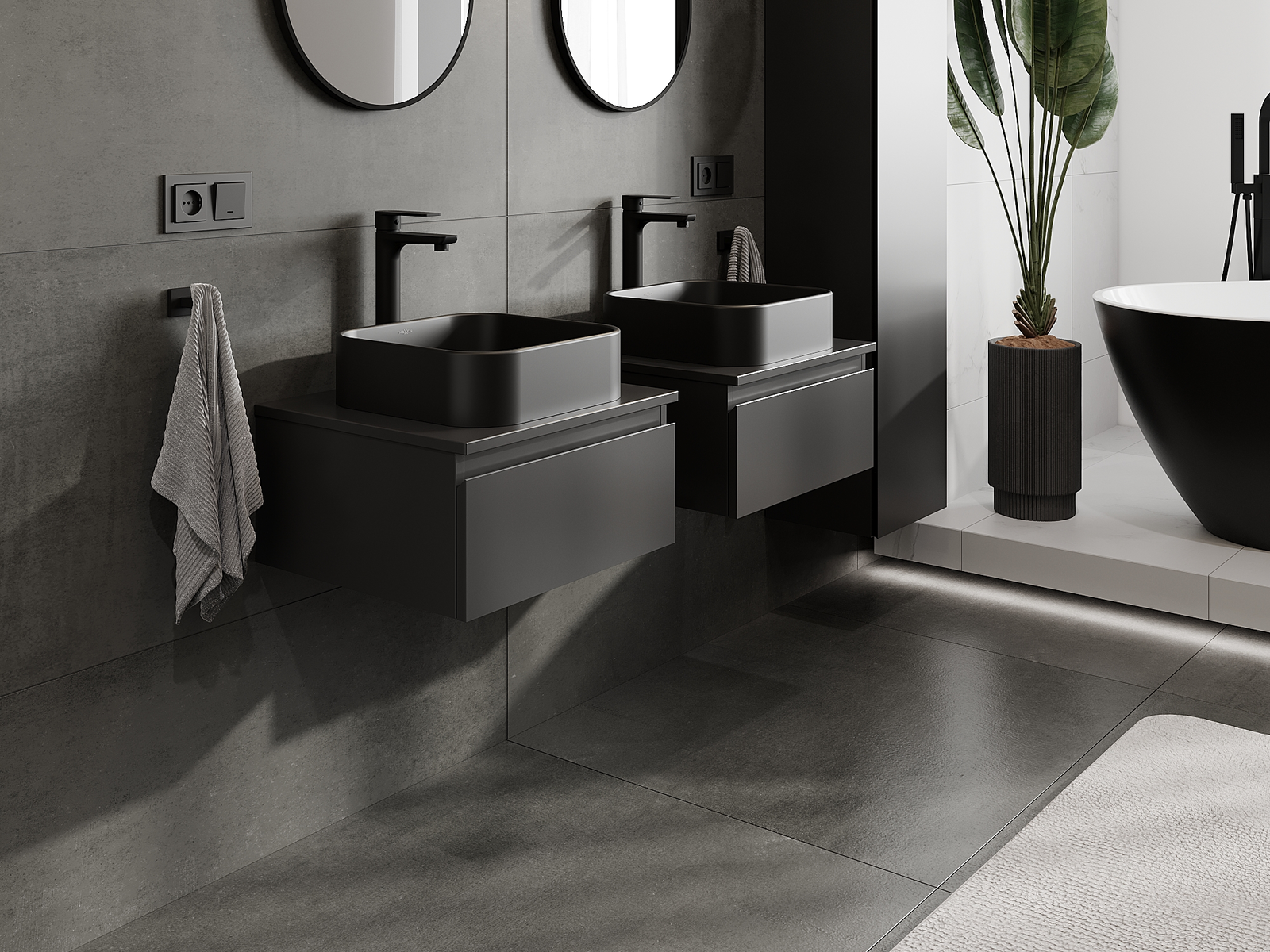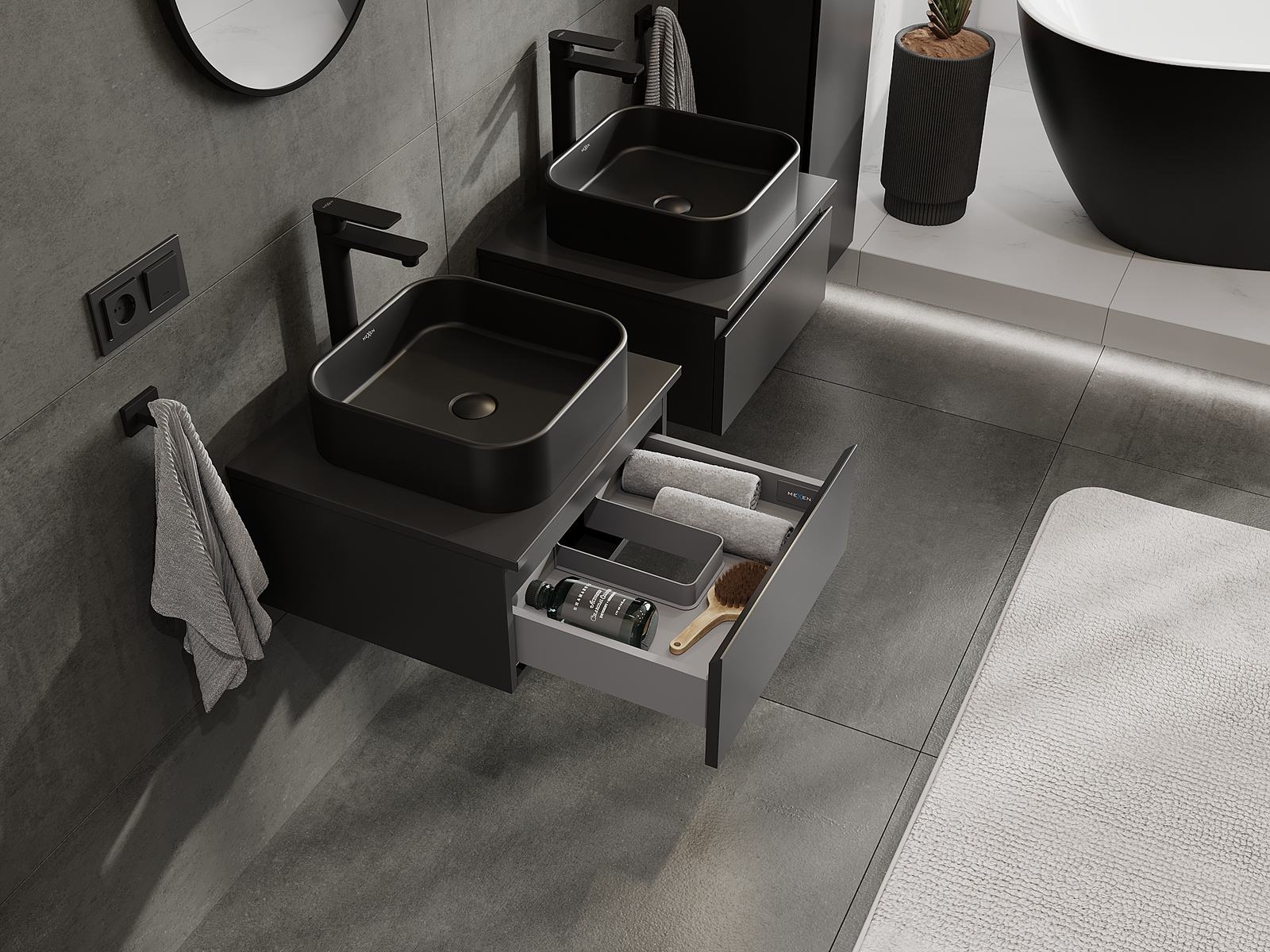 Unsere modularen Badezimmermöbel können in verschiedenen Farbkonfigurationen miteinander kombiniert werden, wodurch eine vollständige Personalisierung ermöglicht wird. Man kann sowohl das Aussehen als auch die Funktionen der einzelnen Elemente auswählen, was es erlaubt, die Möbel an eigene stilistische und funktionale Vorlieben anzupassen.