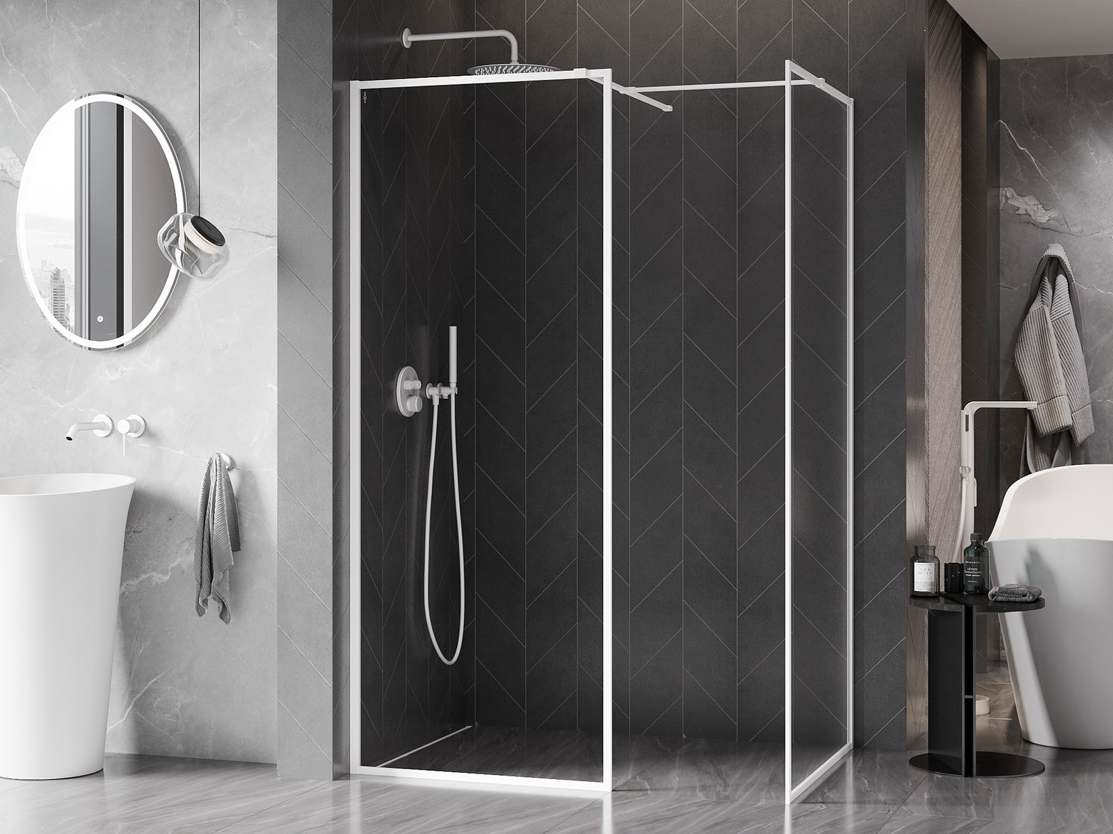Das Produkt kann je nach Bedarf sowohl auf einer Duschwanne als auch direkt auf dem Boden montiert werden. Die universelle Montagemethode ermöglicht die Anpassung des Produkts an verschiedene Arten von Badezimmern und Raumkonfigurationen.