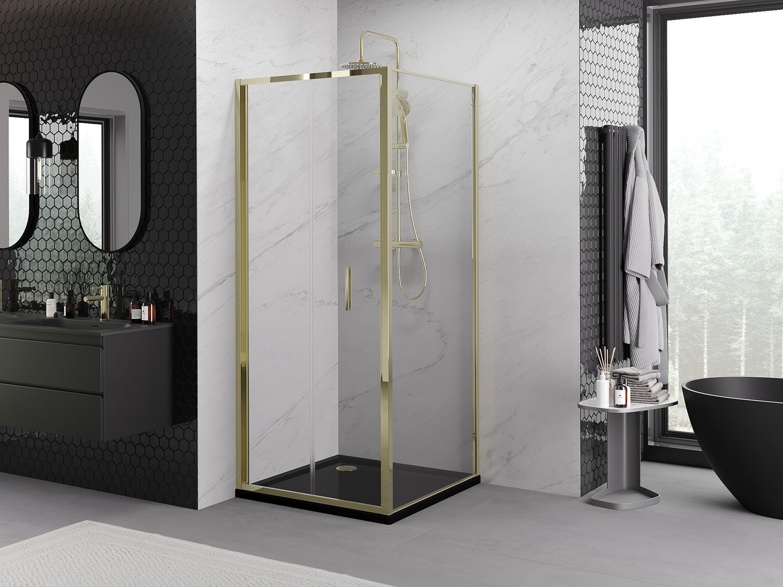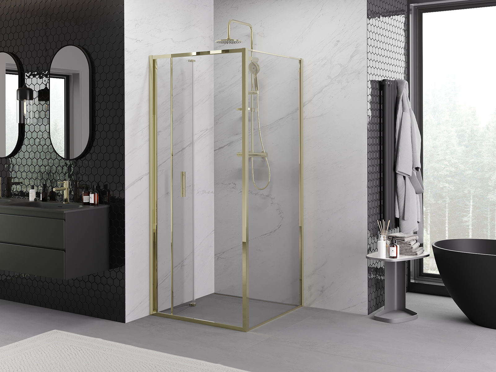 Der praktische und bequeme Griff bestand aus langlebigem und widerstandsfähigem Metall. Die modische Form in Kombination mit einem auf die Farbe der Profile zugeschnittenen Finish verleiht dem Ganzen einen modernen und stilvollen Look und betont die Ästhetik jedes Badezimmers.