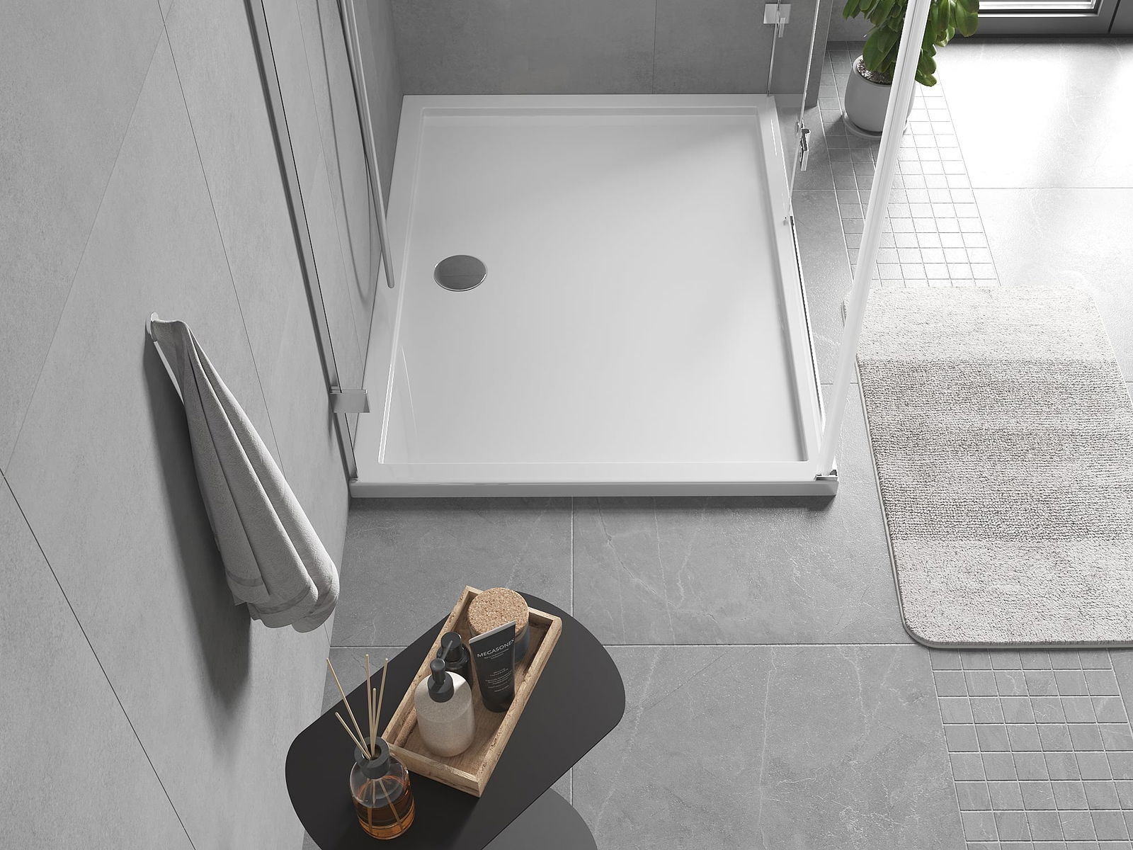 Die Duschwanne wurde so gestaltet, dass Wasser ungehindert in Richtung Abfluss fließen kann. Sie sorgt für eine schnelle und effiziente Ableitung des Wassers von der Duschwannenoberfläche und verhindert die Bildung von Pfützen und das Überfluten des Badezimmers.