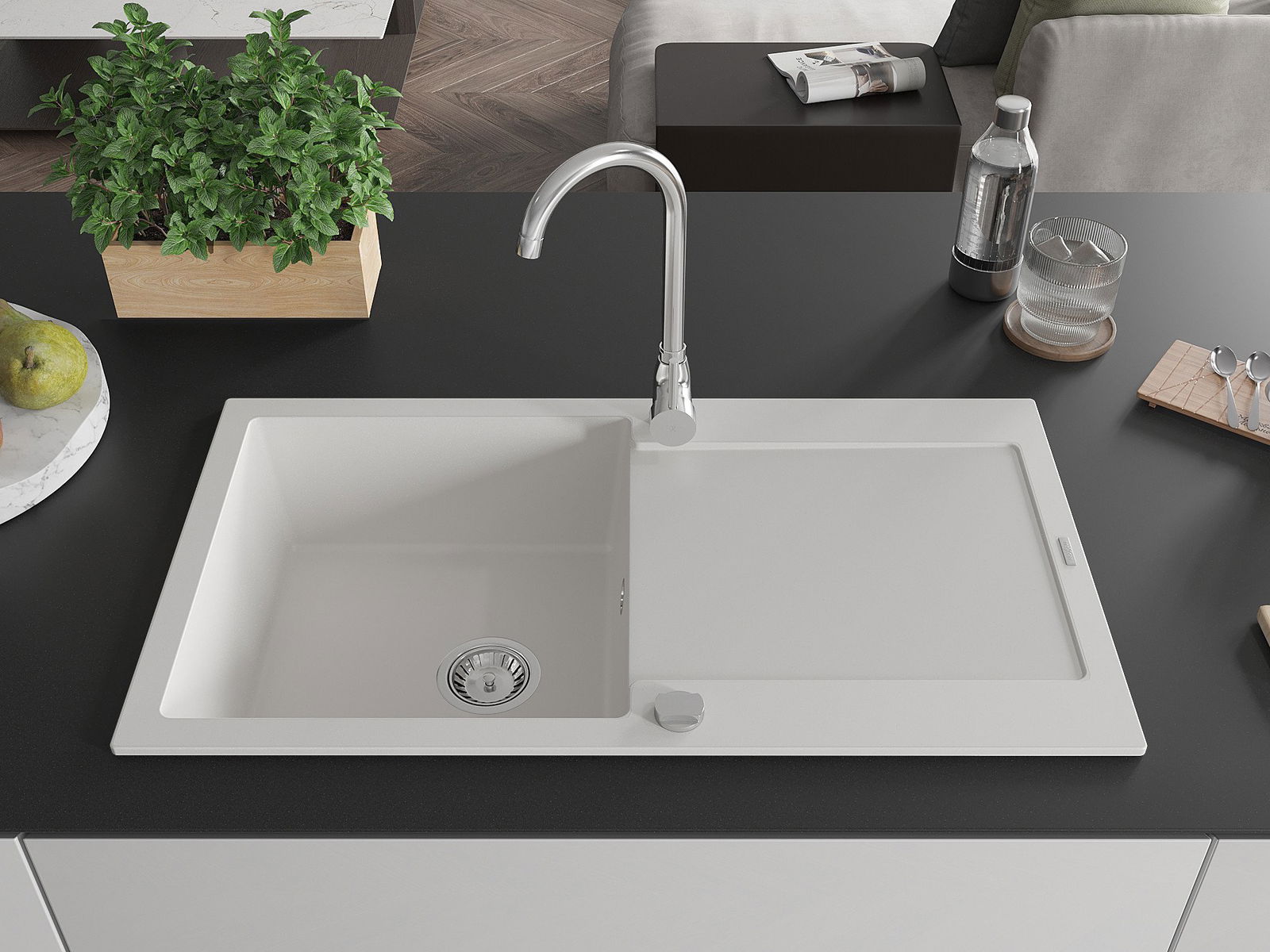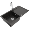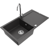 Die Spüle besteht aus hochwertigem Granit. Es ist eine elegante und vor allem praktische Ergänzung zu jeder Küche, unabhängig von ihrem Stil. Hohe Qualität und Granitdauer sorgen für eine langjährige Nutzung.