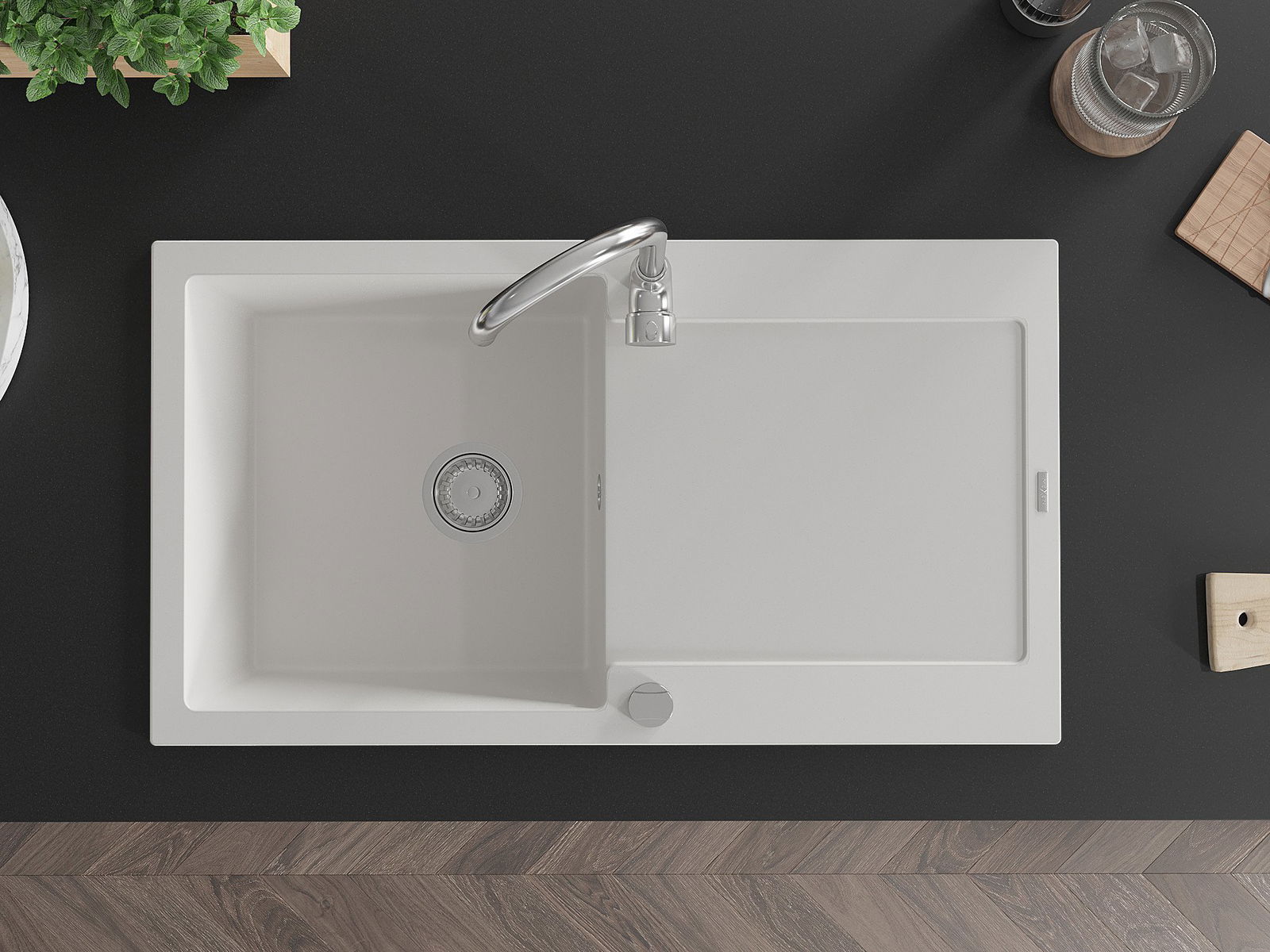 Dank des universellen Montagesystems ist die Spüle reversibel und der Abfluss kann links oder rechts auf der Theke montiert werden. Auf diese Weise können Sie die Seite einfach an Ihre Bedürfnisse und Bedingungen einstellen.