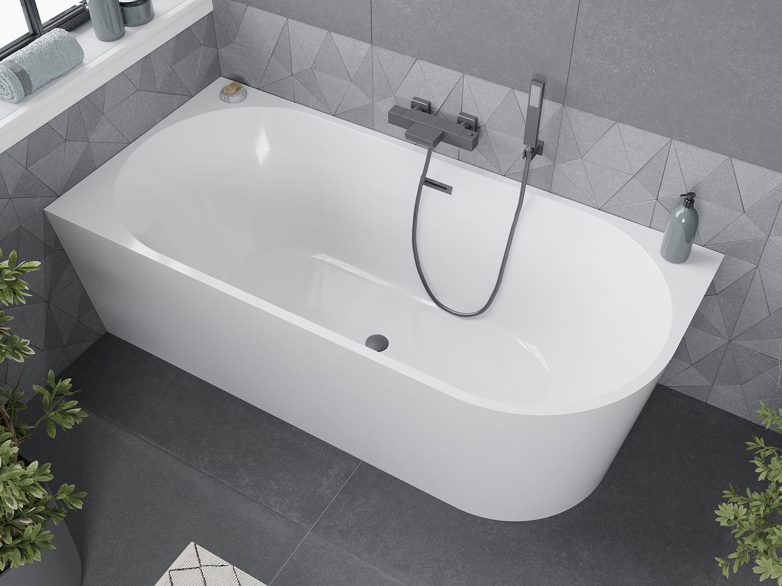 Mexen Mia Freistehende Eckbadewanne links 160 x 80 cm, weiß, mit Überlauf in Gun Metal - 52691608000L-95