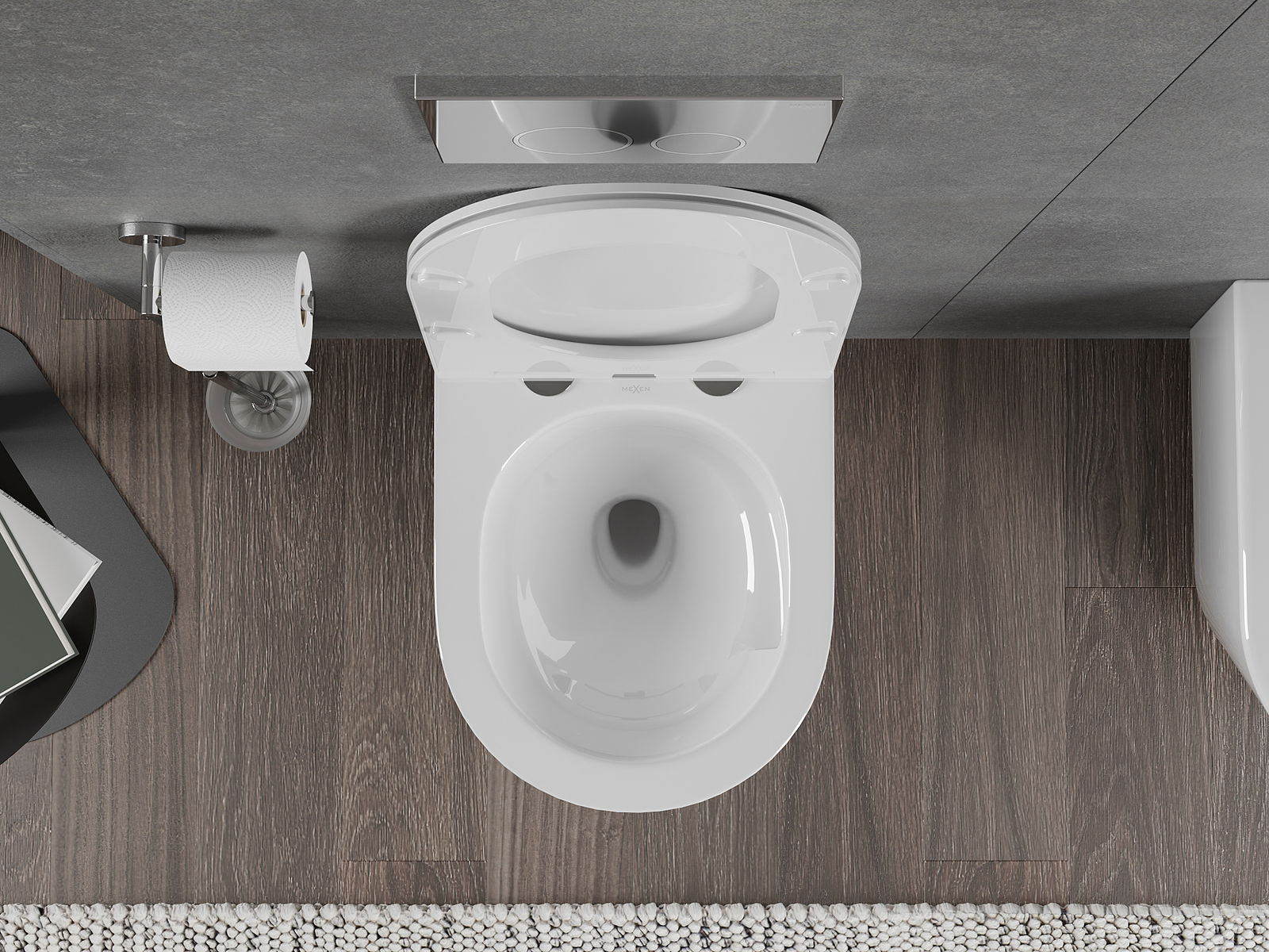Ein System, das sich durch das Fehlen eines traditionellen Randes (randlos) und ein spezifisches, spiralförmiges Spülsystem auszeichnet, das einem Wirbel ähnelt. Das Spülwasser erzeugt einen "Tornado"-Effekt, der die gesamte Schüsseloberfläche schnell und effektiv spült, was zu einer besseren Reinigung beiträgt und die Ablagerung von Schmutz verhindert.