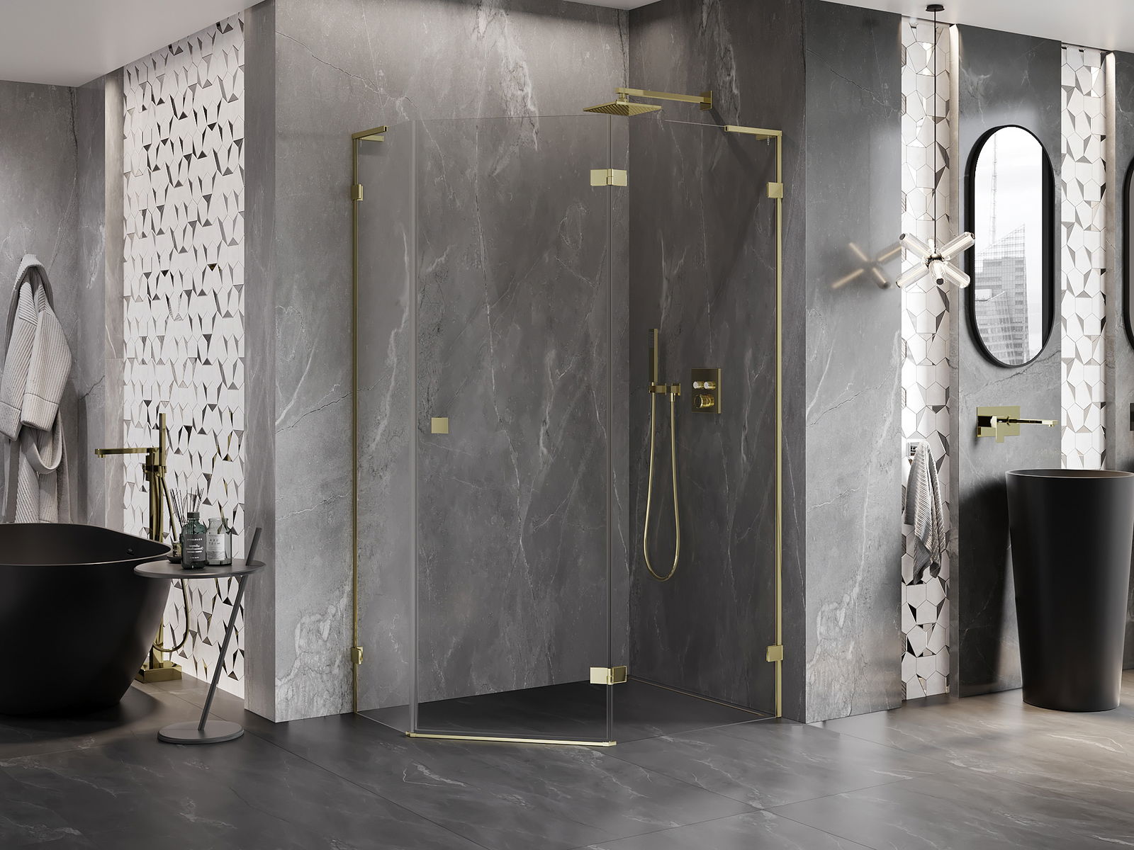 Mexen Lunar L Fünfeck-Duschkabine, rechts öffnend 100 x 80 cm, transparent, gold - 831L-100P-080L-50-00-P