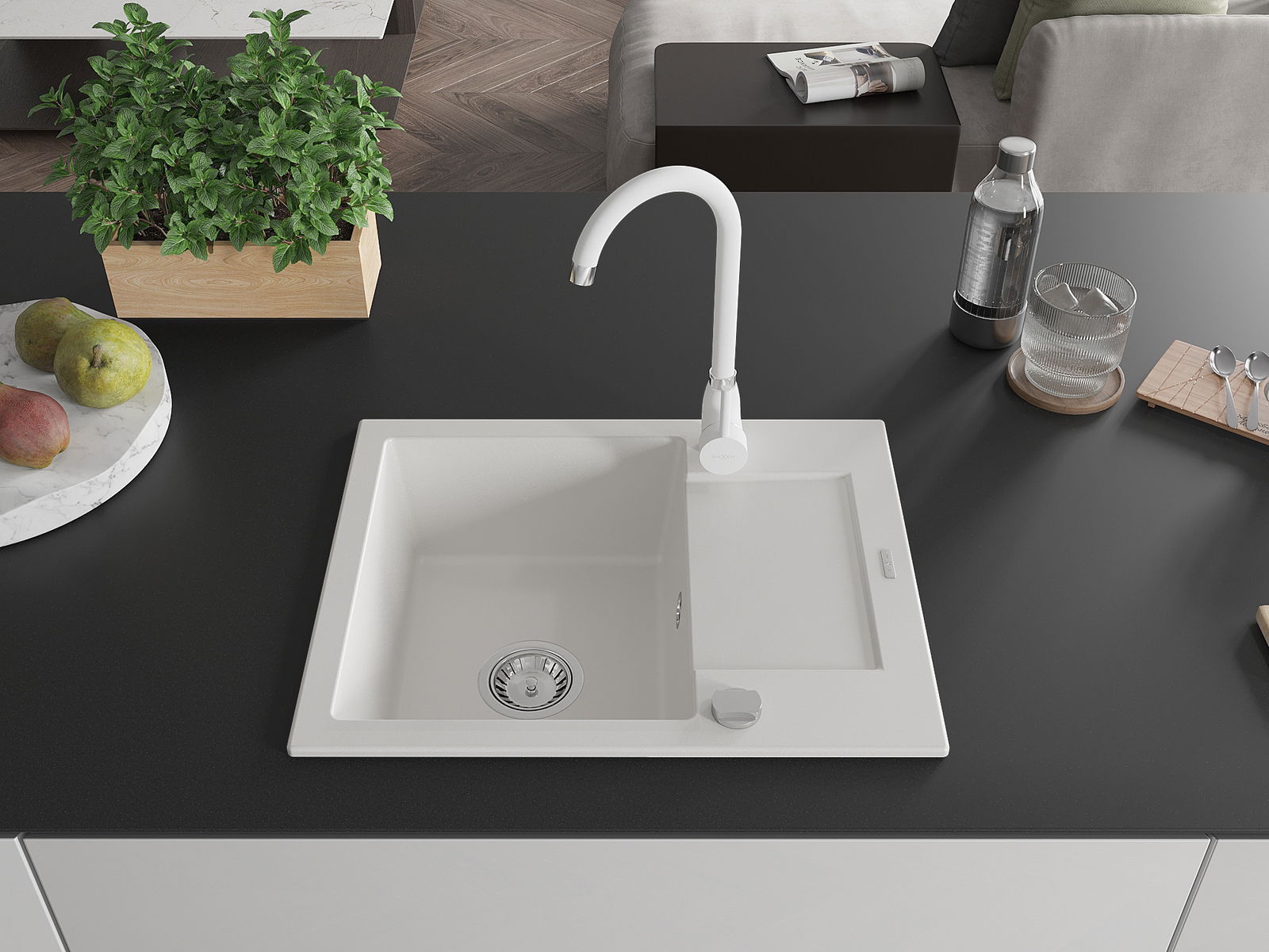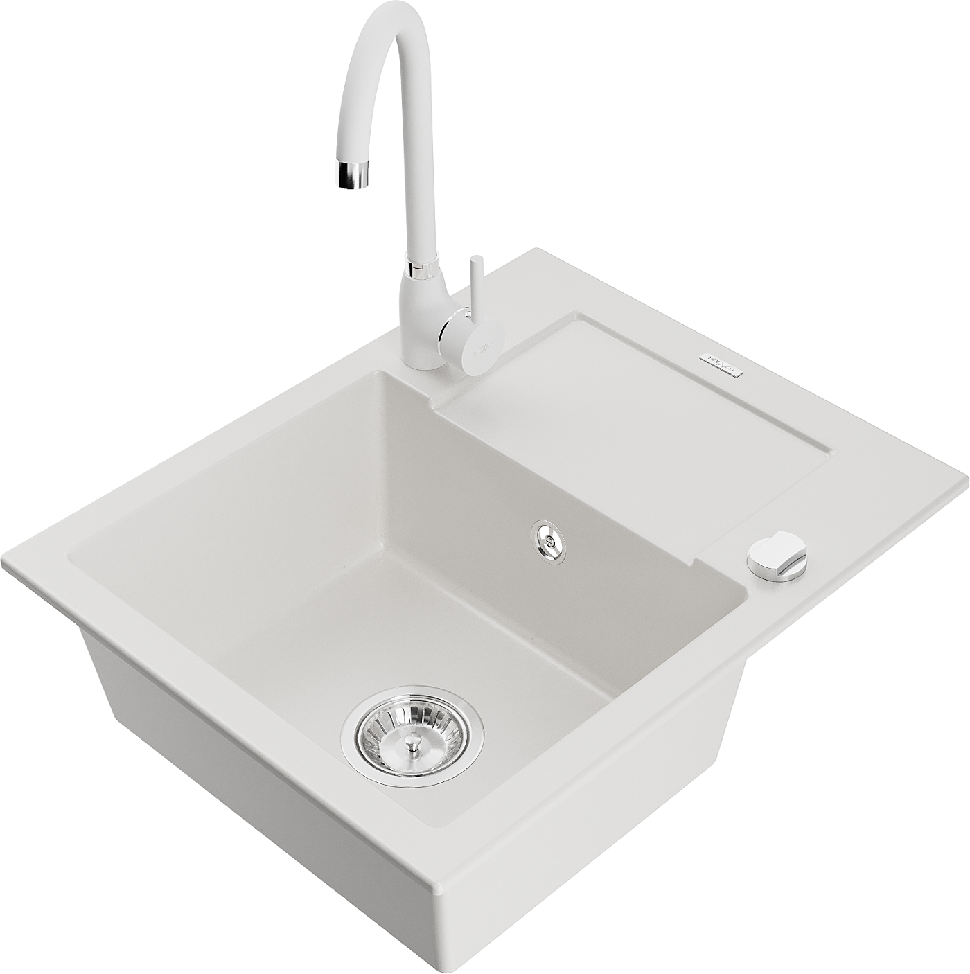 Mexen Enzo Granitspüle 1-beckig mit Abtropffläche und Küchenarmatur Telma, weiß - 6506-20-670200-20