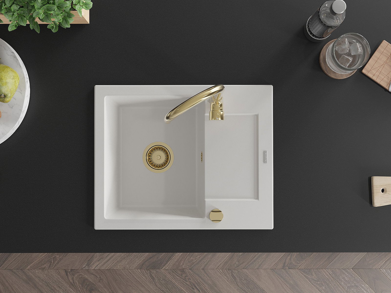 Die Spüle besteht aus hochwertigem Granit. Es ist eine elegante und vor allem praktische Ergänzung zu jeder Küche, unabhängig von ihrem Stil. Hohe Qualität und Granitdauer sorgen für eine langjährige Nutzung.