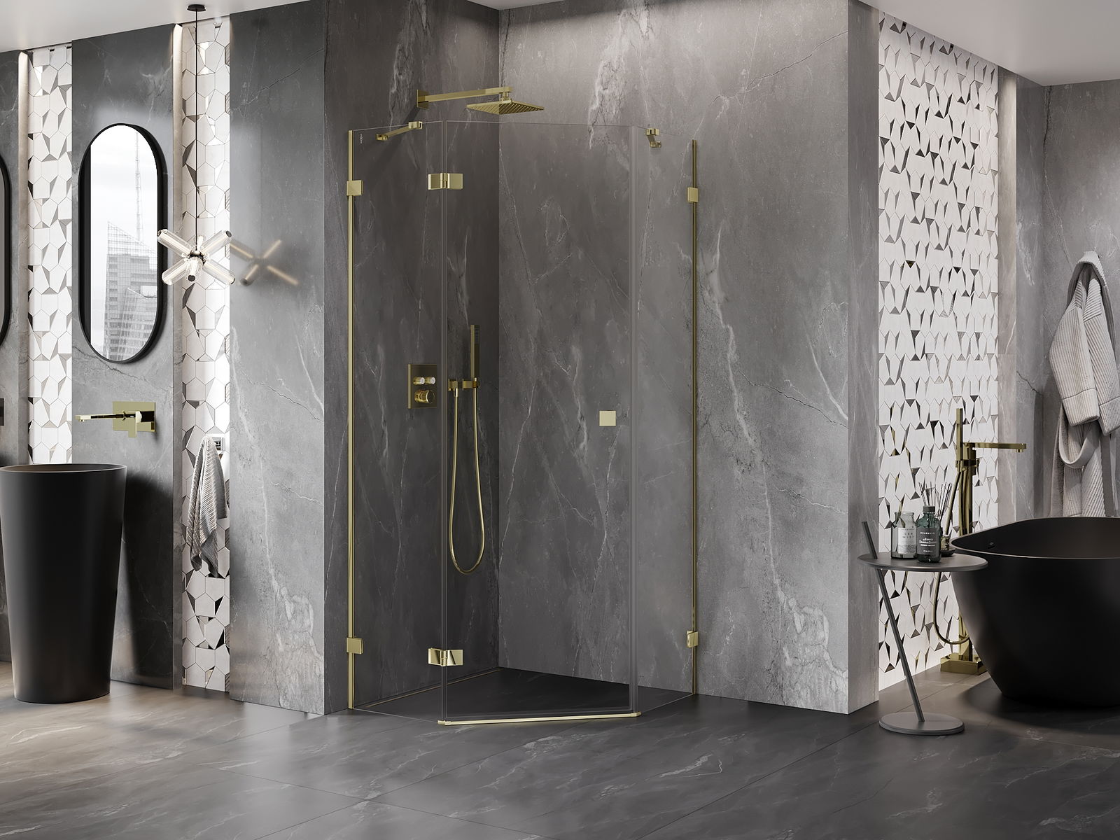 Mexen Lunar Fünfeck-Duschkabine mit Schwingtür links 90 x 90 cm, transparent, gold - 831-090L-090P-50-00-L
