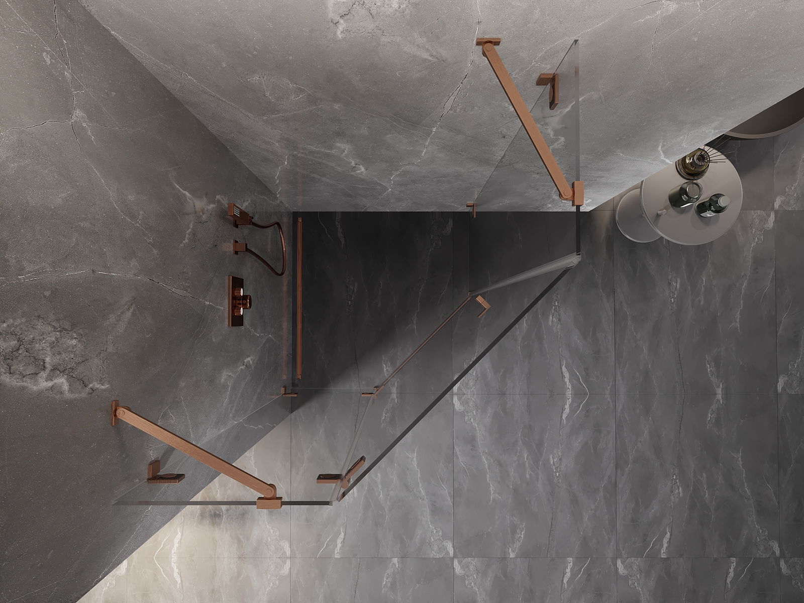 Mexen Lunar Fünfeckige Duschkabine mit Linksanschlag 100 x 100 cm, transparent, gebürstetes Kupfer - 831-100L-100P-65-00-L