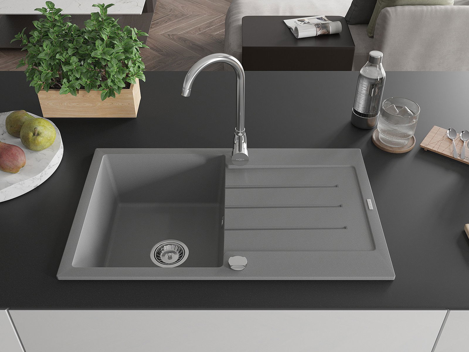 Die Spüle besteht aus hochwertigem Granit. Es ist eine elegante und vor allem praktische Ergänzung zu jeder Küche, unabhängig von ihrem Stil. Hohe Qualität und Granitdauer sorgen für eine langjährige Nutzung.
