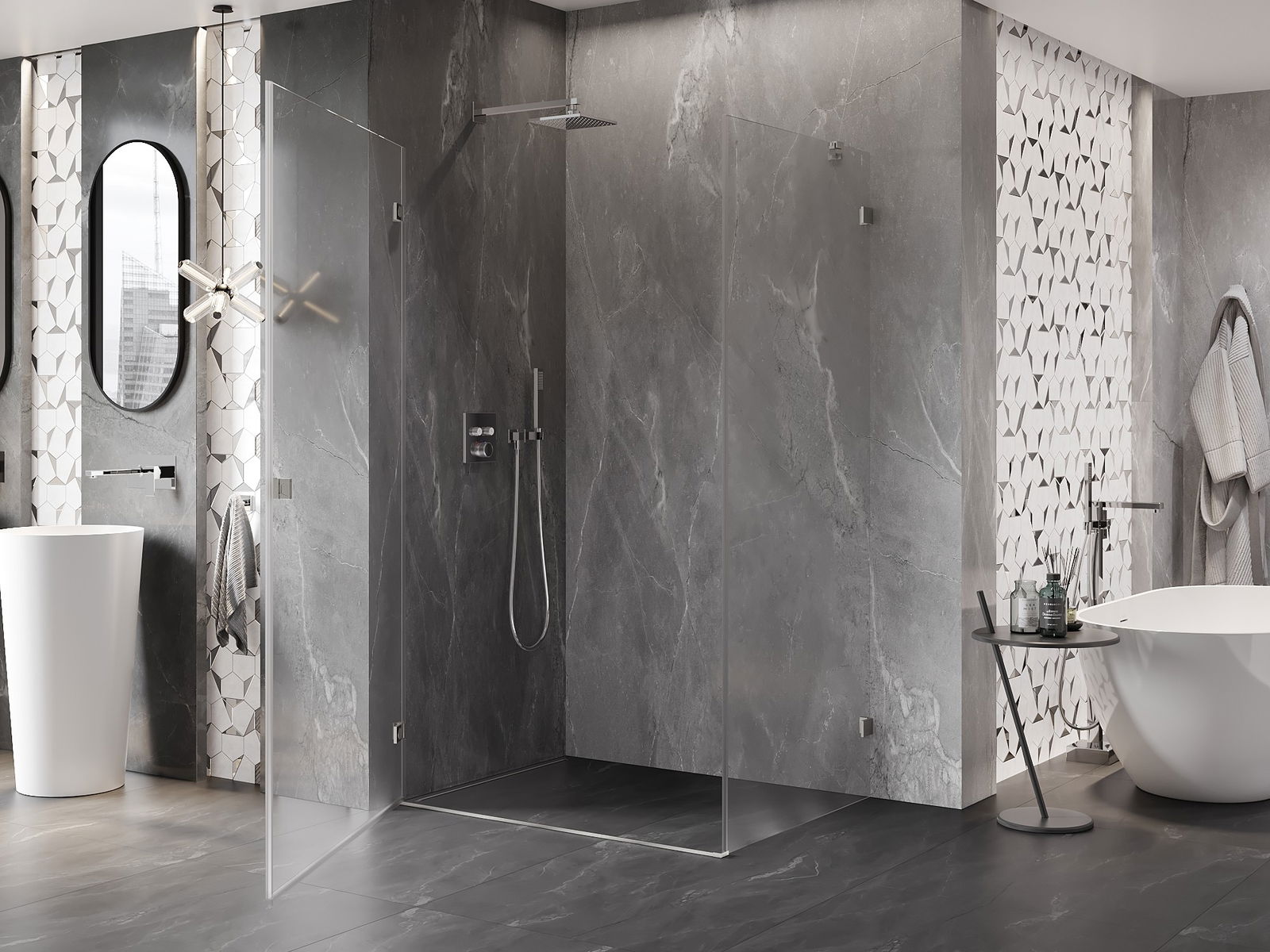 Die Klammern bestehen aus sehr haltbarem Messing und bilden zusätzlich eine flächenbündige Glasscheibe. Dies ist eine ausgezeichnete Wahl, die Eleganz, Haltbarkeit und modernes Design verbindet. Dank solcher Lösungen gewinnt die Dusche an Ästhetik und erleichtert gleichzeitig die Sauberkeit.