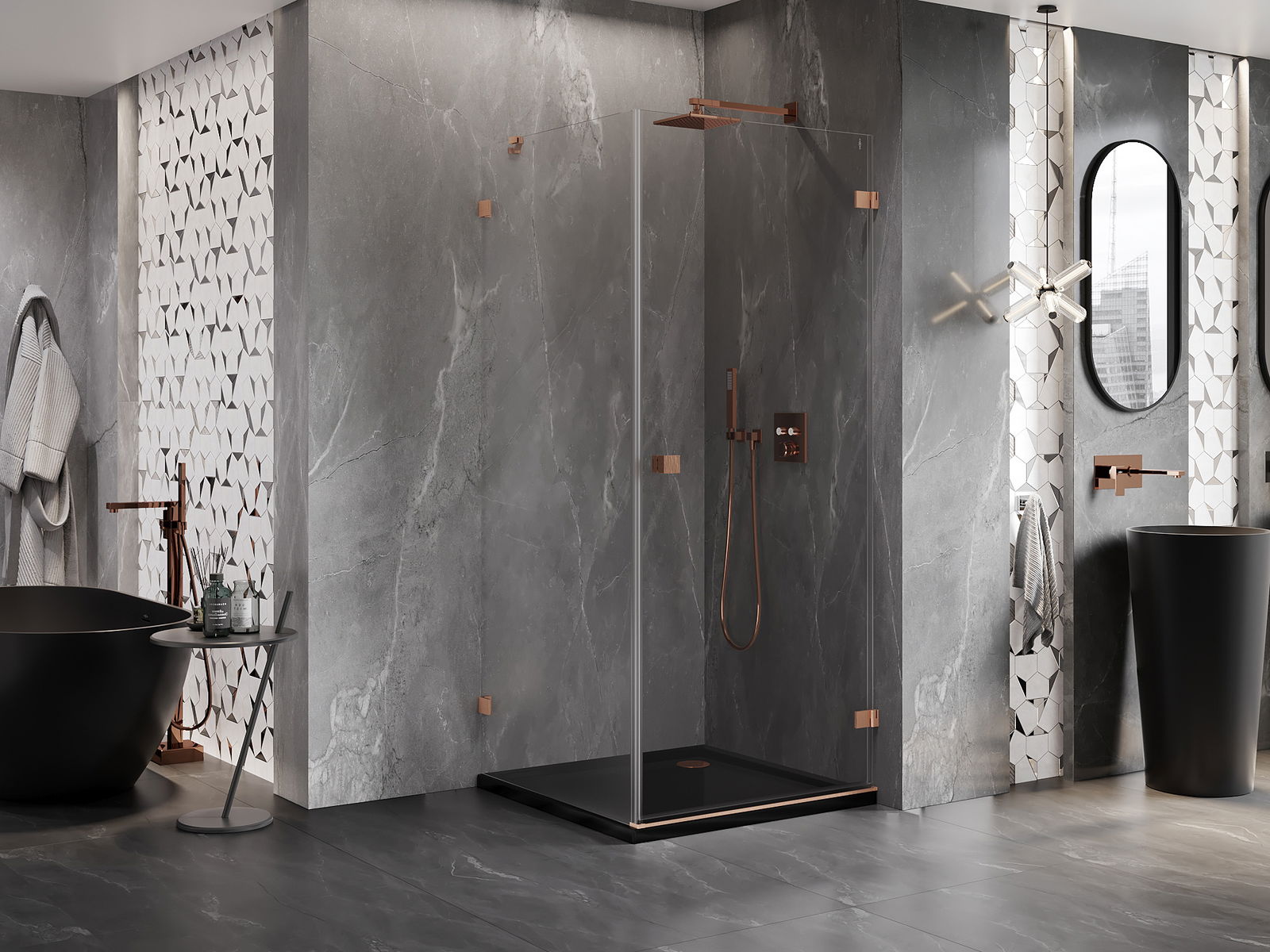 Die Klammern bestehen aus sehr haltbarem Messing und bilden zusätzlich eine flächenbündige Glasscheibe. Dies ist eine ausgezeichnete Wahl, die Eleganz, Haltbarkeit und modernes Design verbindet. Dank solcher Lösungen gewinnt die Dusche an Ästhetik und erleichtert gleichzeitig die Sauberkeit.