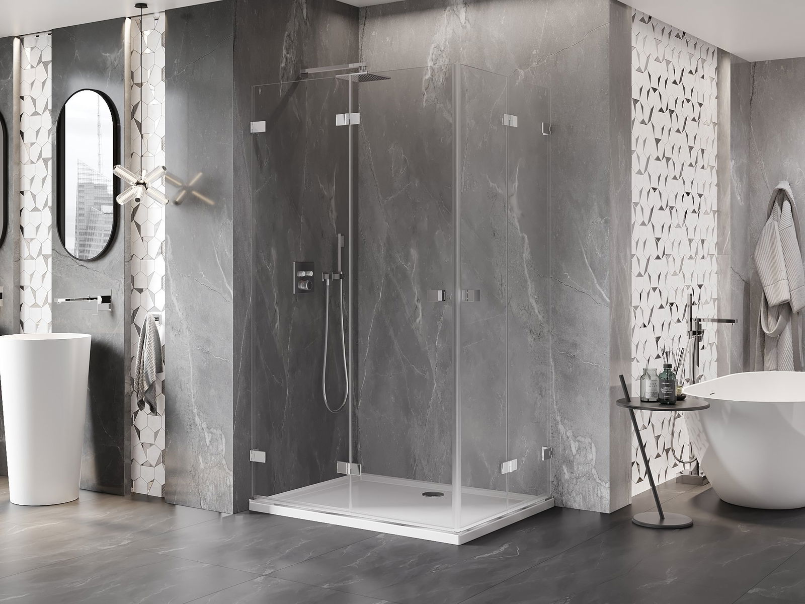 Durch die Möglichkeit, die Tür sowohl außerhalb als auch innen zu falten, können Sie mehr Platz erhalten, wenn Sie die Dusche nicht verwenden. Es ist eine ideale Lösung für kleinere Badezimmer, maximal mit der verfügbaren Oberfläche.